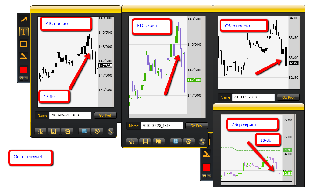 Опять всё по новой!!! Очень достало. frown У меня пашут скрипты, в 10-00 все стартуют нормально, только один, который на 1 минутке тупит, не включается! Я его вручную стоп-старт он пошёл пахать! (но сейчас не про это). Днём всё ок, начался вечерний клиринг, после него пропали данные на графике, тупанул, не сохранил картинку, так из-за этого у моих ботов сдвинулись сигналы! Я перезапустил ботов, история подгрузилась, и тут сразу сообщения о пропущенных сигналах! Следовательно вход в позицию уже хуже, и т.д. Можно поставить как-нибудь принудительную закачку данных, или обновление графиков (отдельный пункт в настройках, кому не надо, тот не включает и время через сколько перезагрузить и за какое период), а то реально бесит. Это всё на СмартКоме. Помогите ПОЖАЛУЙСТА!!!! frown