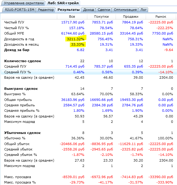 Прикрепляю 2 своих стратегии в общую копилочку, обе заточены исключительно на RIU0 15-минутку. Только мне кажется, что у меня неверно считается их прибыльность.  уж слишком бешеные цифры вижу. кто что скажет? где бешеные цифры и зачем у вас цена входа и MFE% там сами по себе болтаются? вы по той ли бумаге тестируете? RIU0, а не RTSI. смотрите вложение.
