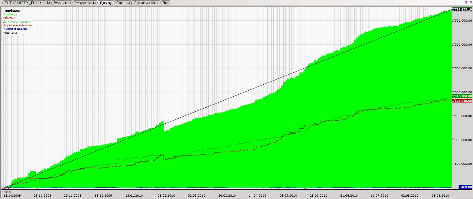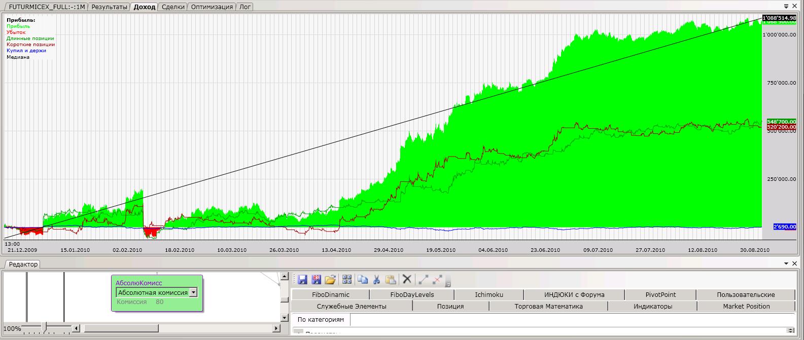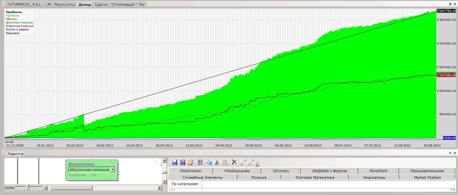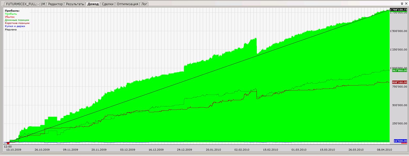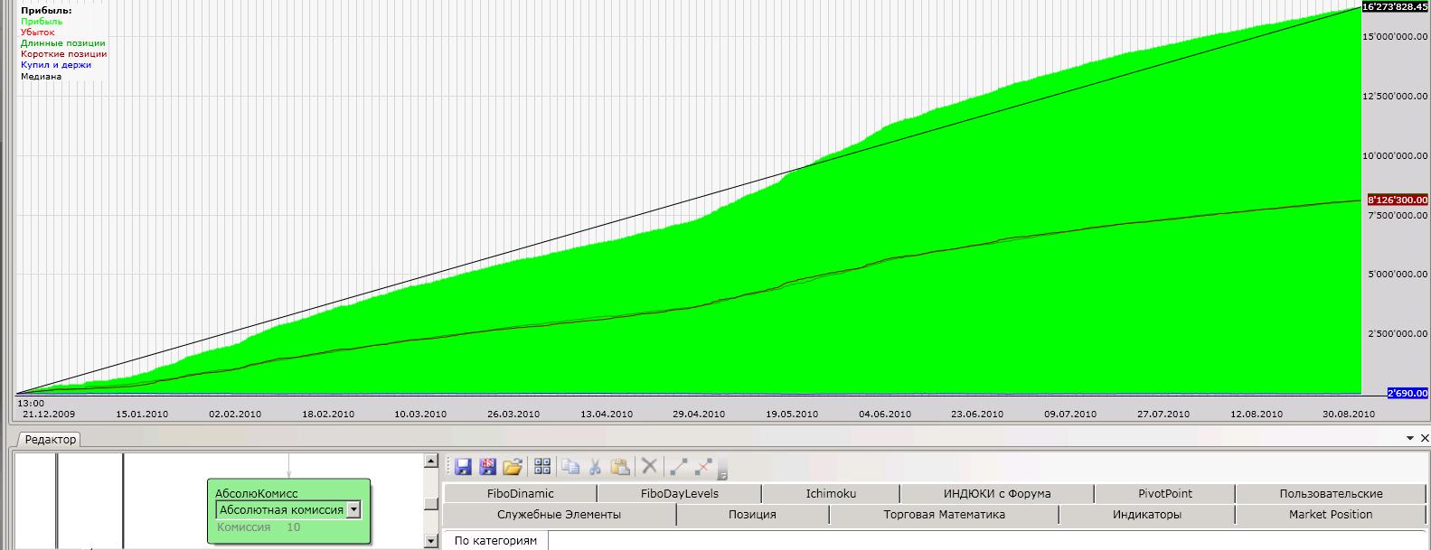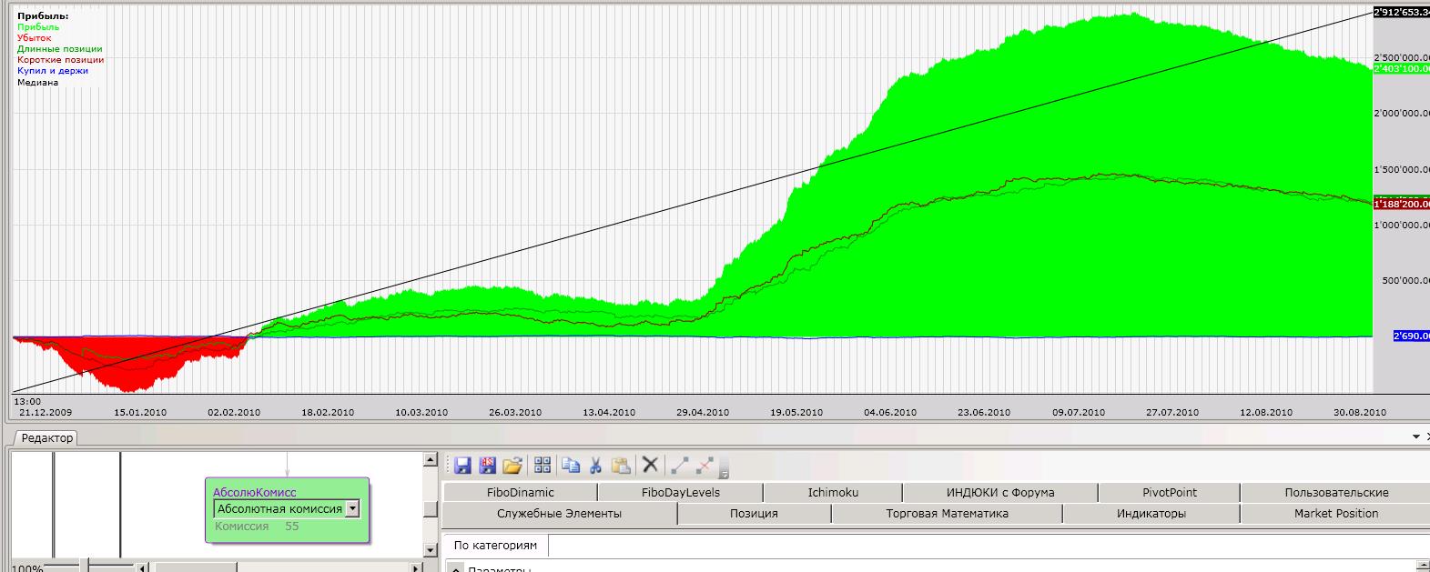 А ликвидности хватит на 1500 сделок с небольшим проскальзыванием? Я думаю, надо комиссию с 2р до 10 увеличить, больше на правду будет похоже. Думаете, я не проверил? №1 До 25 рубл держится в постоянном плюсе. С комиссией 55 рублей теряет стабильность: №2 До 40 рублей "держит эквити", До 80 рубл. держит постоянный плюс на разных участках. Кто, что скажет? На акциях первый скрипт не выдержит комиссий, это точно. Второй вроде имеет право на жизнь везде.