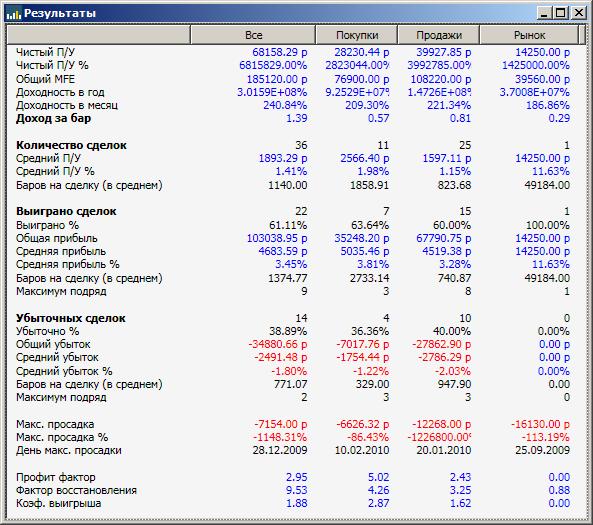 Ок. стратегия работает на фортсе в реале, поэтому думаю и здесь будет работать также. тайм фрейм достаточно большой что бы не пострадать изза низкой ликвидности. специально старался довести до 100 сделок.(не стал заниматься подгоном таймфрейма) кстати проверил свою страту настроеную под фьюч MICEX на данных индекса ММВБ результат очень даже ....
