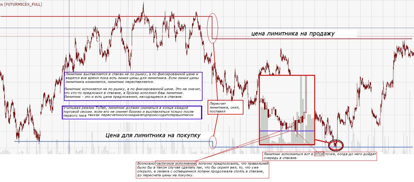 А в реалиях ТсЛаб, лимитник должен оставаться постоянно, пока весь не исполниться. Цена лимитника же будет меняться постоянно, лимитник пересчитывается и выставляется новая цена. Даже если частично был исполнен и это частично уже закрылось. Как то так: