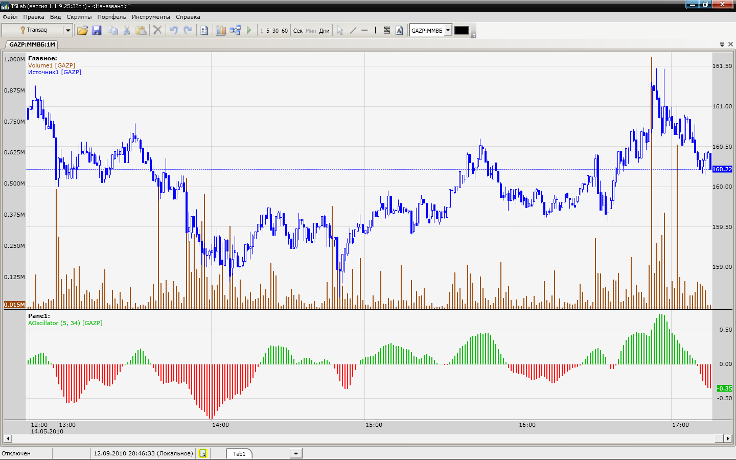 Гистограмма Awesome Oscillator представляет собой разность 5-периодного простого скользящего среднего, построенного по центральным точкам баров (H+L)/2 и 34-периодного простого скользящего среднего, построенного по центральным точкам баров (H+L)/2.