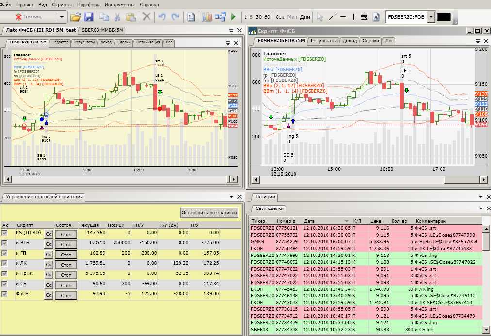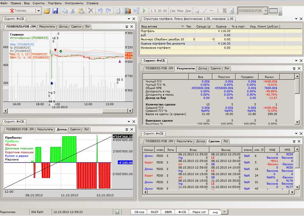Отправил.. подтвердите получение. Проблема до Алора доведена. Сказали решают вопрос. Спасибо за багу. Энди, а Вы уверены, что проблема у Алора? Я еще раз убедился, что скрипт работает абсолютно штатно и корректно, кроме отображения информации в ТСлаб. Дело в том, что это конкурсный счет. Когда я прошляпился в самом начале (вообще-то не только я :-) и просадка не позволяла купить даже один контракт фьючерса ММВБ я полагал, что Алор закроет счет, но этого не произошло. Тогда я решил, чего добру пропадать, сварганил скрипт на фьючерс сбербанка и запустил в работу. В недельном графике результатов скрипт поднял меня из третьей сотнни где-то на пятидесятое место, т.е. СКРИПТ НА АЛОРОВСКОМ СЧЕТЕ работает правильно, но почему-то не ставит цены на графике скрипта, отчего все владки по скрипту по изъящному выражению Нектодрона "кривые". Но это же всё здесь, в ТСлаб..