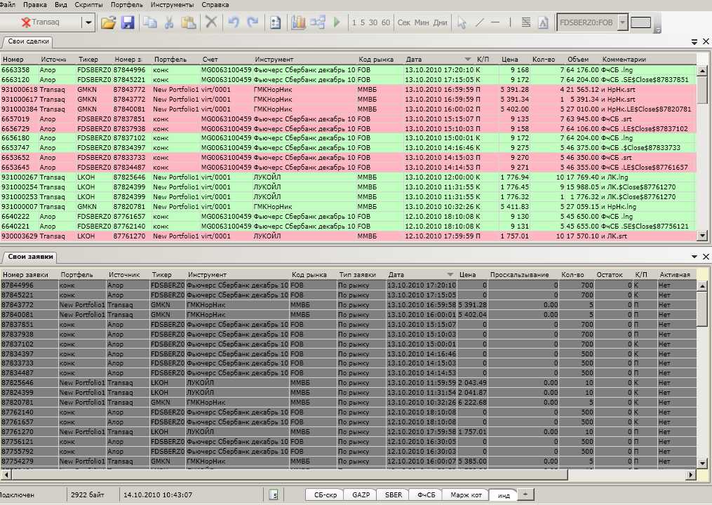 Высылаю скрин "свои сделки", "свои заявки".. Кстати обнаружил, что "свои заявки" не раскрашиваются по желанию клиента, потому черные Это посмотрим.