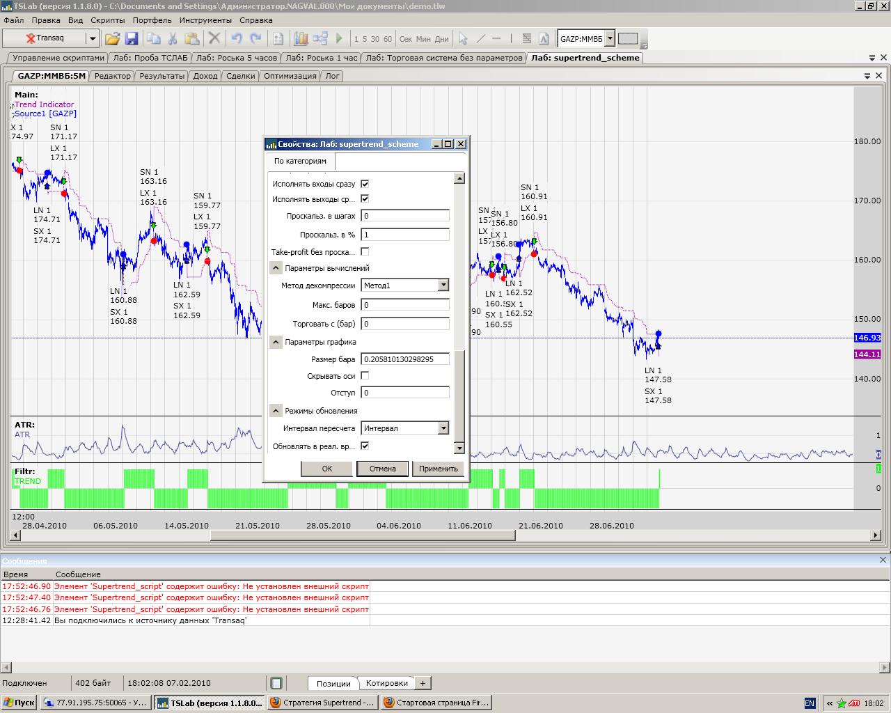 Нет, не в лаборатории.. Вызываешь график скрипта из окна "Управление торговлей скриптами" и на нем крайней правой свечи не видно. ( А может так и задумано? Ведь свеча не закрыта...) Линеечка цены пунктирная бегает, а самой свечи не видно. Мне кажется я нашел в чем было дело. Окно "отсоединялось" от обновления, когда чтото делали со скриптами (запускали/останавливали, меняли количество). Из-за этого же переставала обновляться закладка лог у скрипта. В сегодняшнюю сборку исправления уйдут. Если не поможет, пишите, буду дальше смотреть. Сам скрипт при этом работает нормально, переставала обновляться именно визуализация.