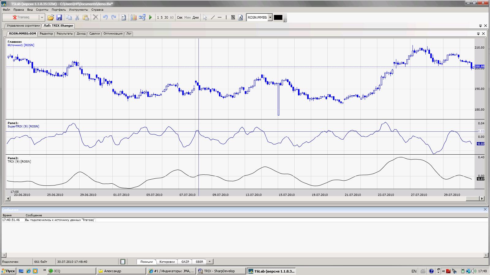 Выход из флета по этим двум индикаторам прогнозируется с необычайной легкостью, как пример: Ваша система работала supertix-ом, например на картинке очень хорошо виден такой вход 17/07/2010, но цена идет против Вас, вернее она никуда не идет - такие места говорят о развороте тренда, следовательно система должна была перекинуться с работы SuperTrix на работу Trix. На самом деле не очень хорошо видно.Поясните пожалуйста. Трикс входит в рынок, условие, если цена за две свечи ушла ниже/выше входа или коэфициент движения рынка(можно почитать вот здесь ) ниже определенной величины,скрипт должен переключиться на супер трикс...