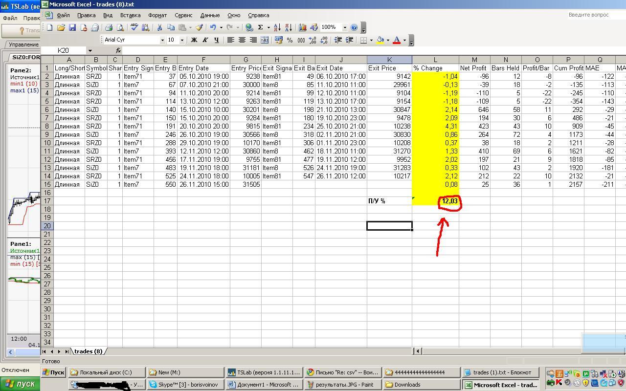Далее сгоняю все сделки в эксел, для проверки расчетов и получаю 12.03%. Совпадает.