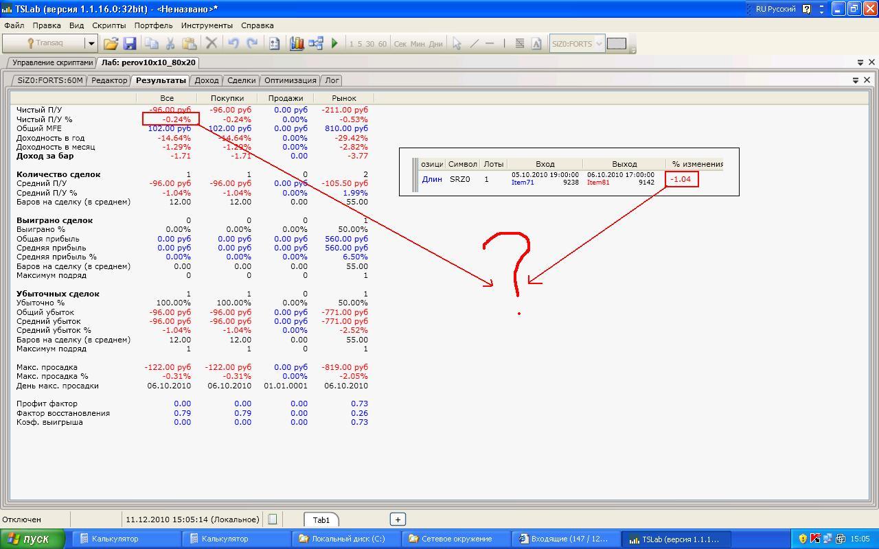 выкладываю еще один расчет. прогонка этого же скрипта скрипта, всего с одной сделкой, результат которой -1,04%. но, не смотря на это в Чистый П/У - появилась цифра -0,24. вообщето должно быть равно! в начальном депозите - 40.000. сделка одним лотом SRZ0.