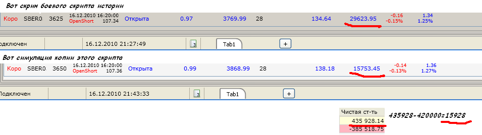 На боевом счете у финама работает скрипт. Так вот когда я смотрю результаты торговли, вызывая свойства скрипта из "управление торговлей скриптами", то там мне показывают так скажем недостоверные результаты по каждой сделке. И как итог в реальности у меня доход на сегодняшний день 16000 (по показаниям состояния портфеля), а скрипт рапортует по вкладке доход и сделки, что у меня доход 30000руб. Я всецело разделяю его оптимизм, но это хрень какая-то. При чем если я делаю копию этого скрипта и там на том же участке истории прогоняю симуляцию, то у меня совпадает итоговый результат с реальным. В боевом счете у меня 420000 начальный депозит, в симуляции я ставлю 380000, ну в реале из-за долбанного транзака торгует только на 90% от портфеля. Короче объясните что за хрень твориться? Как мне видеть реальные сделки в программе??? что за торговля наугад?