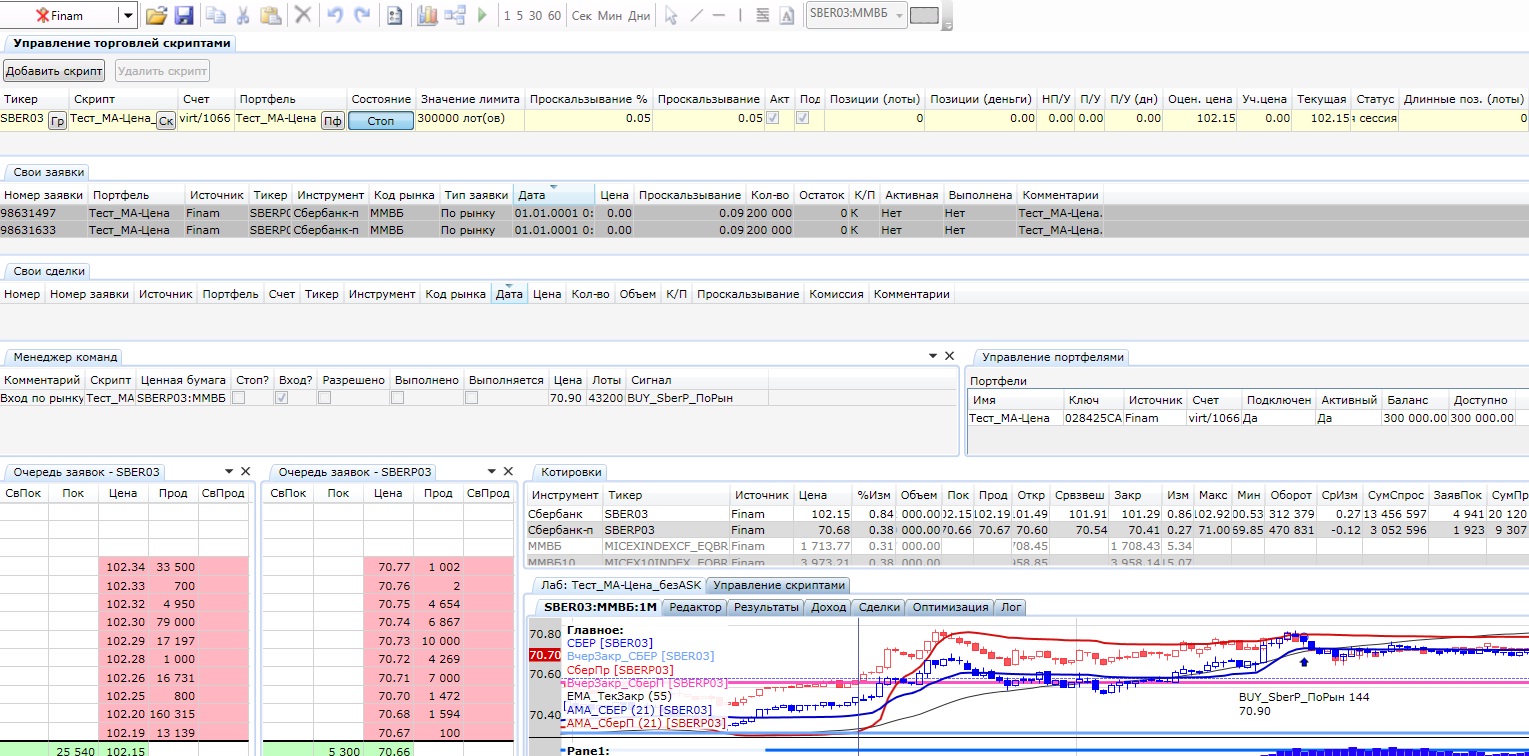 1.А зачем тогда эта фича "Портфель", если сам счет является портфелем? Или на реальном счете возможно разделение? 2.Как не задавая таких глобальных настроек, как Добавление пользователя, или установки еще нескольких Лабов и подобных "танцев с бубном", можно подключить несколько скриптов к демо счету Финама, а в последствии просмотреть, что натворил каждый из них. Итог работы каждого, в т.ч. суммарное измениение счета от действия конкретного скрипта.