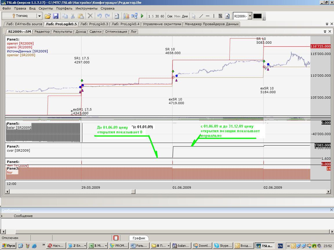 Начнет. Сборка уже доступна, можно посмотреть. Ок, блок "цена входа" работает - выводится на график, учавствует в расчётах в формуле и выводит значение из формулф на график, НО почему то наполовину - на истории из текстового файла не выводится и не рассчитывается с 01.01.09 до 01.06.09 (хотя вх и до и после есть), после с 01.06.09 и до конца даты 31.12.09 выводится и рассчитывается, помогите пож.выявить причину?. Вышлю всё что нужно, скрипт, текстовый источник (м.б. дело в нём). ----------------------------- Разобрался, извините! В визуале делаю попытку управления количеством позиции, для этого создал гору блоков на вход с разным количеством, а цену входа тестил только на одном блоке...