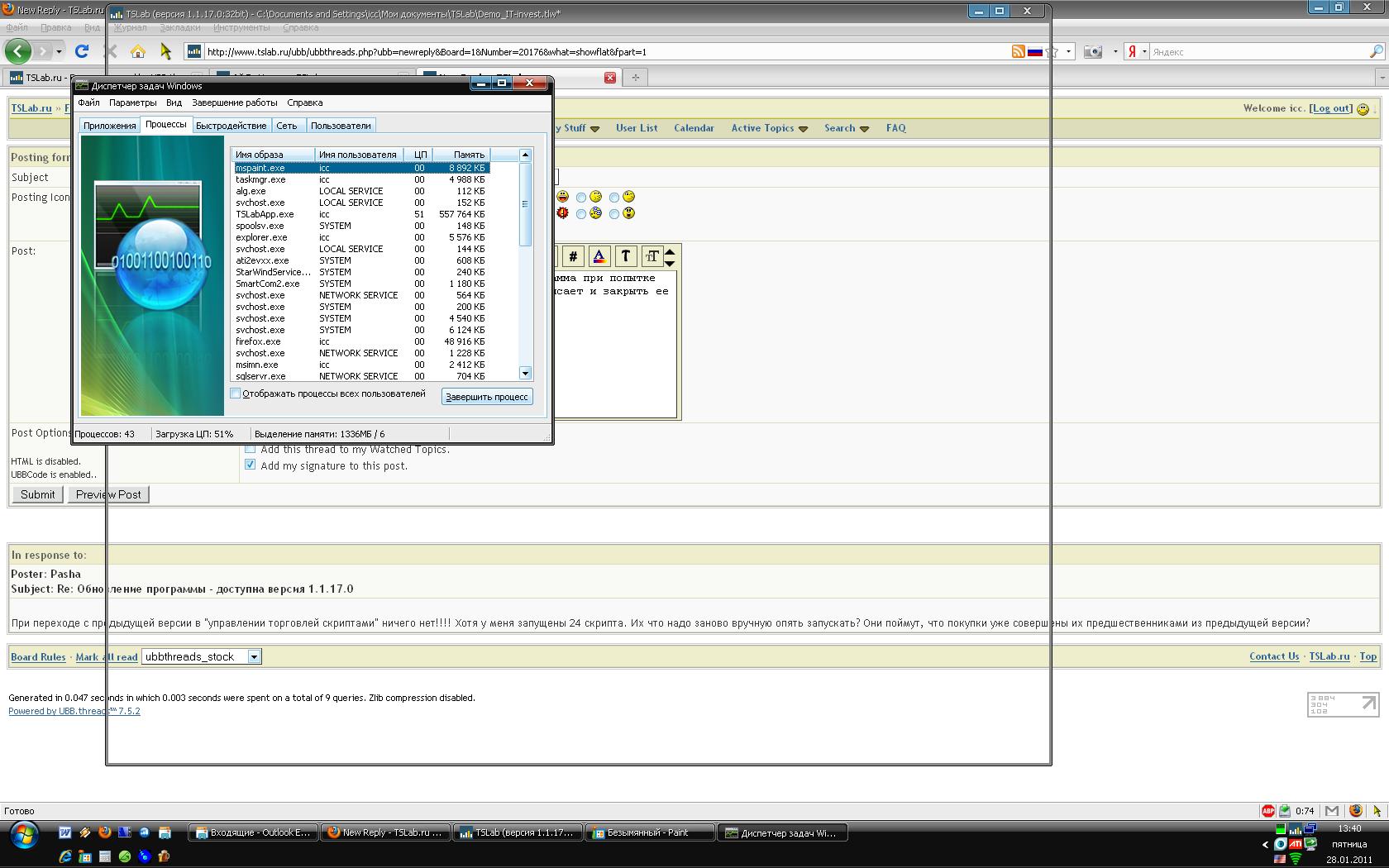Добрый день. Помогите, после обновления, программа при попытке соединения с сервером брокера(айти инвест) зависает и закрыть ее получается только из диспетчера задач. там файл тслабовский (в скрине)зависает.