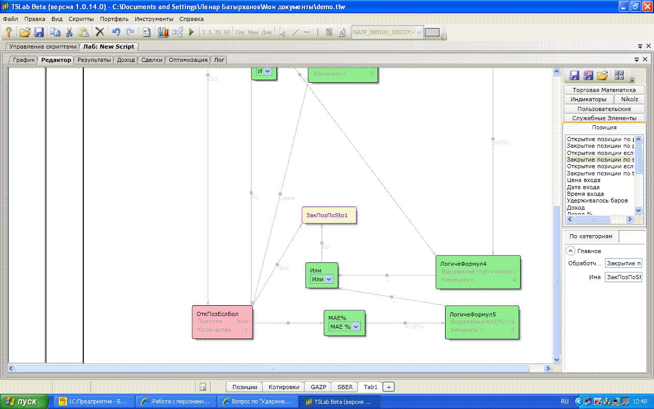 В "логической формуле" для блока "закрытие по рынку" я написал выражение: date!=date[i-1]&&(profitb-a)>0