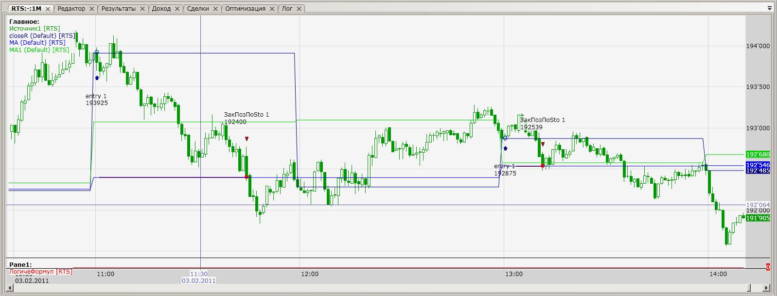 №2 Сжатие/разжатие Блоки сжатие и разжатие, всегда используются вместе.В программе автоматически включается авторазжатие в следующих случаях: 1. в формуле сходятся разные сжатые интервалы (если один и тот же, не будет авторазжатия) 2. вывод на график результат работы индикатора, который что-то посчитал в сжатом виде Исключение, при котором нужно использовать ручное разжатие(блок Разжать) нужно использовать, когда в блоке формула используются сжатые данные(данные от блока сжатие) и не сжатые(данные от блока источник). Что такое сжатие и разжатие? http://www.tslab.ru/ubb/ubbthreads.php?ubb=showflat&Number=8077#Post8077Когда используются?1. Несколько "Экранов" - стратегии Элдера 2. Стоп на позицию необходимо поставить сразу, после входа в позицию. 3. Нестандартные данные. Каждый час начинается не в 10:00, например, а со сдвигом в 30 минут, в 10:30. Примеры: A/ Необходимо на минутный график вывести закрытия баров часового таймфрема и дневного таймфрейма. Так же необходимо вывести на график классический МАКД с часового и классический стохастик с дневного таймфрейма. В приложении пример "А". Блок "Сжатие" всегда считает в единицах таймфрейма источника, если в источнике минуты просто подсчитать, что например в сутках 1440 минут(это все равно, что дневная сессия, т.к. после закрытия дня, данные не идут, а следующие начинаются только на следующий день), в трех часах - 300 минут, в часовом - 60 минут. Если в источнике Секунды,важно только знать, что в одной минуте 60 секунд. Блок сжатие в секунды, нужен для того, что бы создать секунды из тиков В/ В примере "В", стратегия покупка/продажа при пересечениях закрытия свечи и ЕМА на таймфрейме 5 минут, с выставлением стопа на сервер брокера через 5 секунд после входа. С возможностью существования двух разнонаправленных позиций. В приложении пример "В". Следует учесть, что пересчет скрипта будет каждые 5 секунд, а не каждые пять минут, что сильно нагрузит Ваш компьютер при расчете всей истории. Например для того, чтобы произвести расчет индикатора на последнем баре для нашего случая, периода 21 с пяти минутного таймфрейма, программе нужна всего история: 21(кол-во 5 минуток)*300(кол-во секунд в 5 минутах)= 6300/5(таймфрейм)=1260баров + какое-то значение, для исключения ошибок = 1300. (Следовательно, на реально торгующем скрипте, данное значение "1300" (для периода 21, 5 минутного таймфрейма, с пересчетом каждые 5 секунд) следует поставить в графе "Максимум баров" в свойствах скрипта, для уменьшения скорости пересчета, данная рекомендация относится только уже к торговому скрипту, стоящему на реальных деньгах). Данная рекомендация - не к исполнению, следует знать формулы индикаторов, чтобы точно знать сколько баров нужно для расчета(Например для EMA нужно минимум умножить нашу цифру на пять, а для JMA в общем случае(формулы могут отличаться) нужно умножить на 20). А так же в торгующем агенте как правило должно хватать баров, что бы на графике был виден последний вход и выход из позиции. Пересчет - это математические вычисления данных в скрипте(индикаторы, логические вычисления и т.д.), по данным пересчета, на закрытии свечи источника(в нашем случае 5 секунд), происходит обмен данными между сервером брокера и программой. Именно в этот момент скрипт отправляет информацию на сервер, о новых заявках, которые насчитал пересчет Источник и сжатие можно выводить на одну графическую панель: