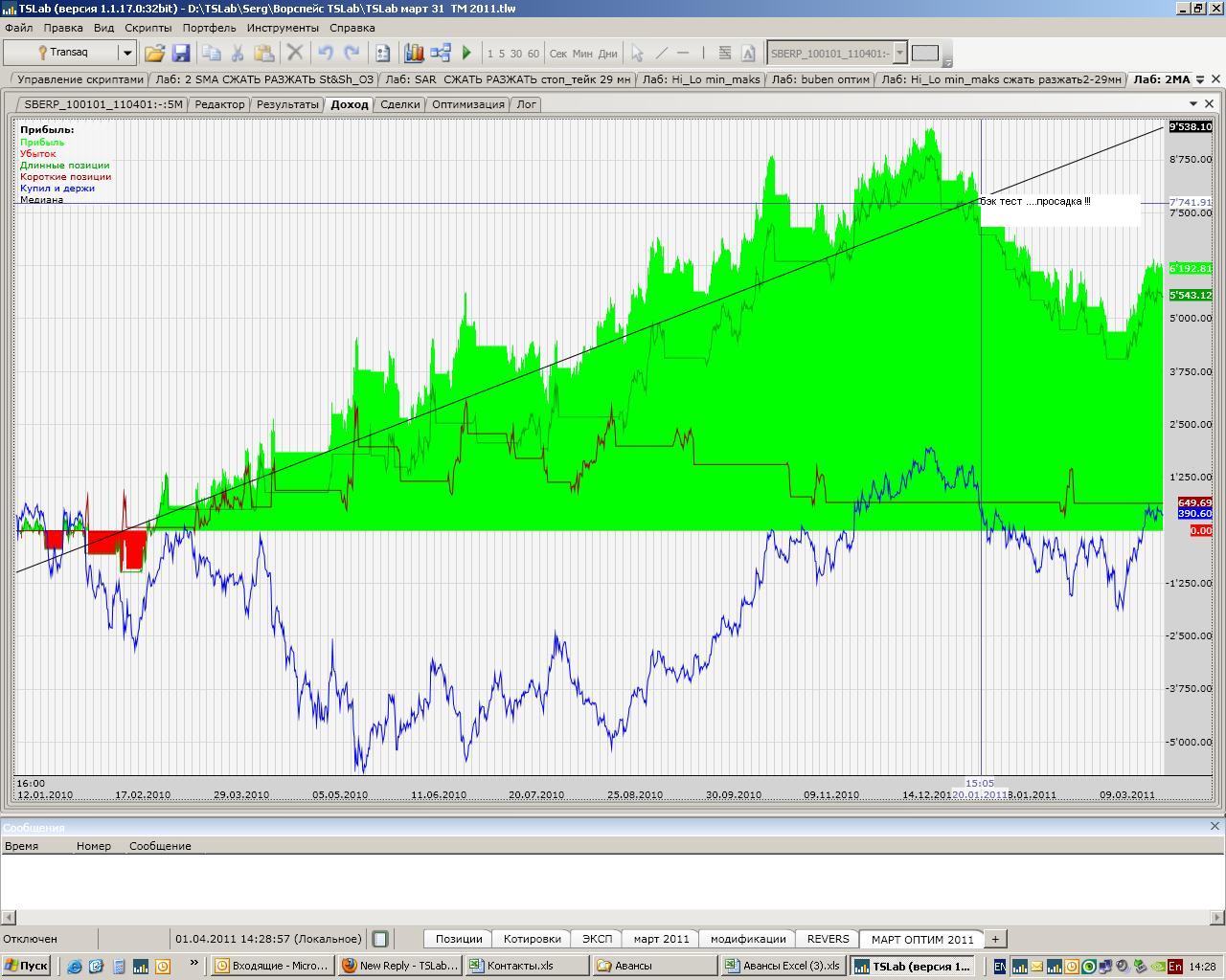 Общая картинка красивая. На первый вгляд в глаза бросилось то, что шорты в пиле2 оптимизировались на сильном движении вниз в первой четверти графика. А там можно сказать и не пила вовсе была, а тренд поймали. Остальное время фактически во флете отработали. Вот лонги покрасивше смотрятся) С шортами замечал такое, когда тестировал на истории, куда попадал 2008 год. Часто вся 5ти летняя прибыль в этот обвал и образовалась. Приходится из оптимизации исключать частично этот период, а уже после смотреть, как скрипт будет себя вести при прогоне на нем без оптимизации. Это так, небольшим опытом делюсь (причем не утверждаю, что удачным)) Опять таки, если взять общую картину Тренд с марта, то как раз на ней этот трендовый рывок вниз в Пиле2 слизан, стоит во флете, и потом уже начинает ползти вверх. Все же не любит этот тандем резких движений. Любопытно было бы посмотреть, как он отработает с января 2006 по май 2005 года. Нет такой картинки? Р.S. Вовсе не пытаюсь сказать, что скрипт плохой. Просто привычка такая, со всех сторон рассмотреть ситуацию постараться ) хорошая привычка. Истории с 2006 года нет. И лично мне неинтересны 2008г. и особенно 2009г. 2009 супертрендовый год был, а оптимизировать лучше на кривых коленцах. По поводу отработки шортов: скрипт торгует с переворотом, а рынок очень по разному ходит вверх и вниз, так что универсального подхода нет наверно. Ну как минимум для низкочастотных скриптов. Я кстати большинство скриптов делю на работающих только в лонг и только в шорт. Но речь я заводил именно про резкую пилу и отсутствие тренда. вот под такое и клеил кубики. Про оптимизацию: брал период с марта 2010 и искал оптимальный вариант именно для тяжёлых участков. В любом случае спасибо за мнение и анализ. собственно для этого и выкладывал.