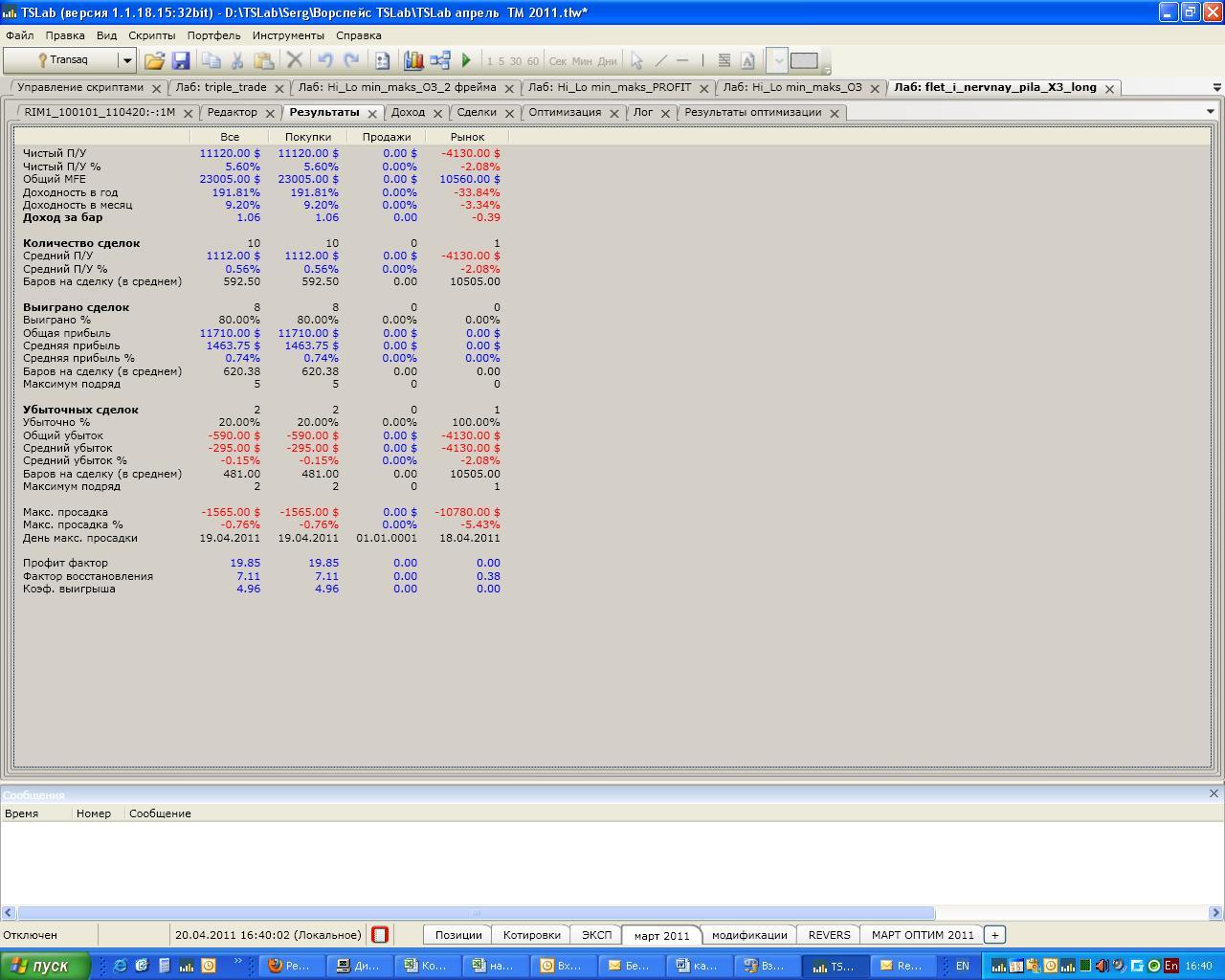 Однако 2005-2006 годы были еще более супертрендовыми, чем 2009. Да и до конца 2007 вообще не хило росли. А уж какой тренд был в 2008 году. Так что если посмотреть на наш рынок (конкретно фьюч РТС), до ноября 2009 мы были почти всегда (за исключением некоторых участков) в сильном тренде. И лишь последний год движуха поспокойней стала. Конечно, если скрипт рассчитан на пилу, то оптимизировать лучше на ней, но хочется ведь так же быть "уверенным", что если завтра начнется новый сильный тренд, то скрипт не сольет ему счет, а хотя бы будет держаться на плаву до тех пор, пока не начнется консолидация. Собственно именно так и ведёт он себя на тренде: вяло растёт или стоит на месте. это видно по картинкам. А для трендового рынка выкладывал другой http://www.tslab.ru/ubb/ubbthreads.php?ubb=showflat&Number=18927#Post18927