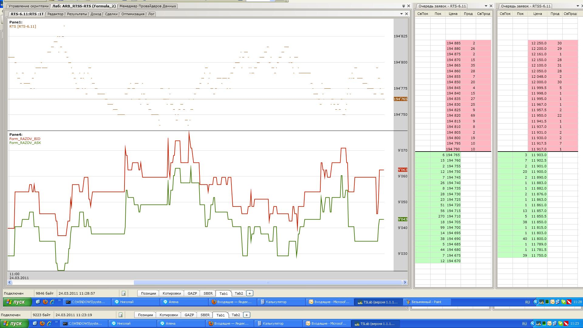 Приветствую! Сделал на формулах скрип показывающий раэдвижку между RTS и RTSS, аск минус бид, бид минус аск, проще некуда. Понаблюдал, или я в формуле что то не так составил, хотя там всего три мат. действия или тслаб считать не умеет.))