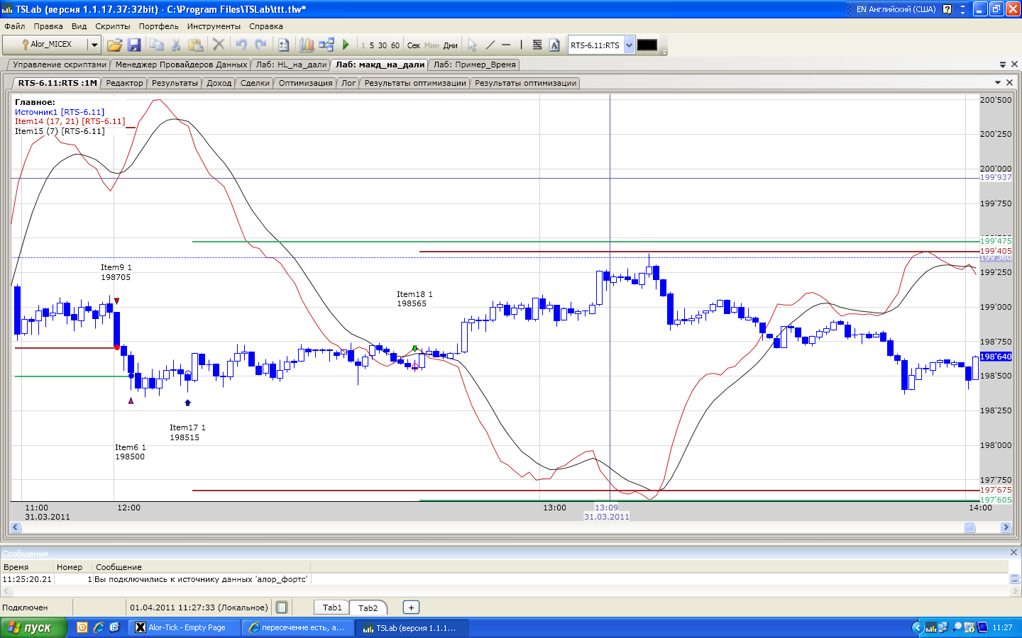 у меня алгоритм по МАКДу, входим по пересечению, а выходим по стопам и тейкпрофитам...но почему то пересечения есть, а сделки -то есть, то их нет... прикрепил картинку: