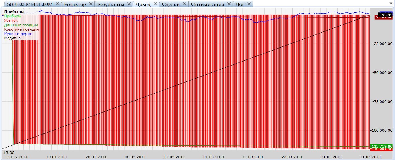 Начальный депозит: 67633, В блоке открытия на лонг: количество 2, на шорт 1, значение лимита: 98% от портфеля, вид имитации: Рассчитывать изменения.