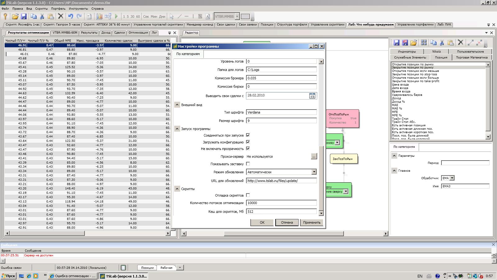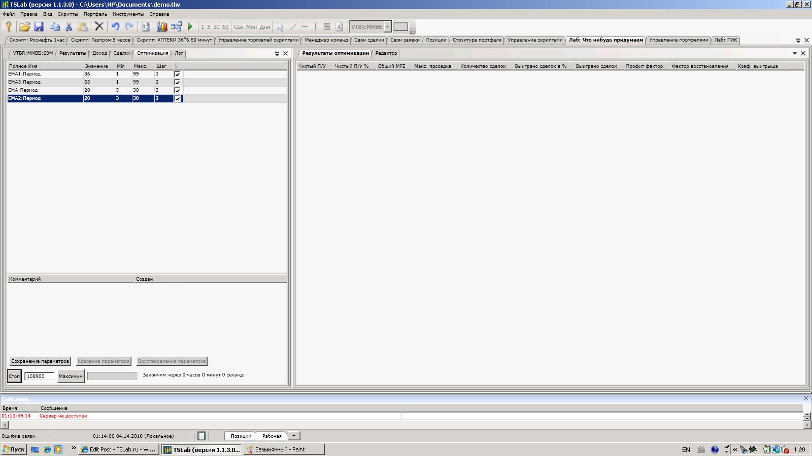 А при оптимизации более 100000 проходов. Программа ведет себя вот так. При чем я знаю, что успею написать это сообщение и комп вырубится. Но дело в том, что весь компьютер работает сейчас без проблем. Загрузка проца 80%. Работают все включенные программы и приложения, кроме TSlab. Подскажите пожалуйста, что мне сделать?
