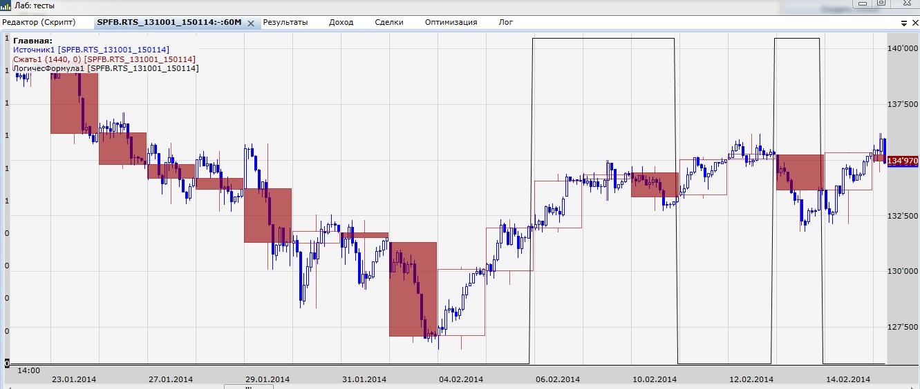 Что-то похожее на правду на главном скрипте получается только если в блоке Логической Формулы прописать: Открытие3[i-15]<Закрытие3[i-15]&&Открытие3[i-1]<Закрытие3[i-1] (рис.3). То есть здесь он почему-то после блока «Сжатие» отказывается воспринимать дневные свечи, работая с ними как с часовыми, а в тестовом скрипте (и в главном скрипте за один блок до, в логформуле «ЕстьДневнаяСвечаВниз») – все нормально.