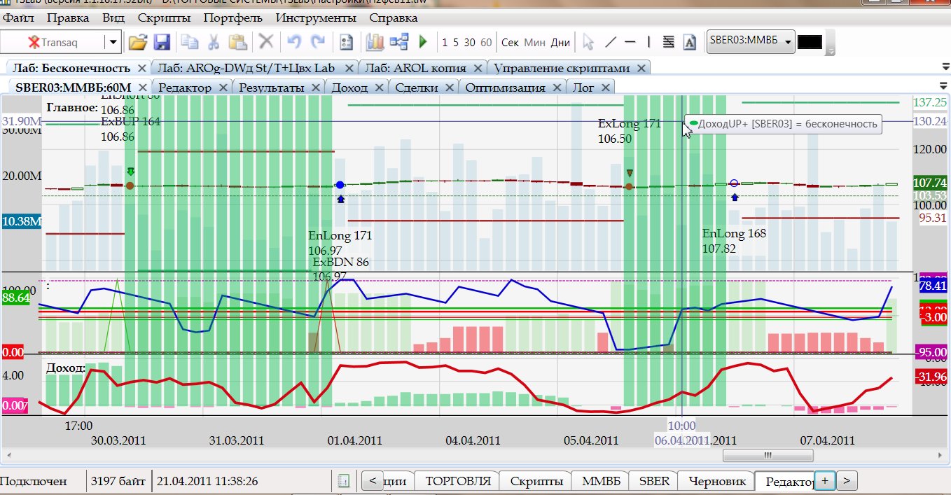 Разобрался сам. Если кому интересно, то проблема была в делении на "0". Значение блока Цены входа после выхода из позиции обнулялось. Сделал в формуле проверку: если Цена входа == 0, то возвращать вместо предыдущего выражения - "0". Вопрос к разработчикам (просто хочется понимать как работает то, что делаешь): когда происходит деление на "0" график действительно должен отображать NaN (или бесконечность) или это какая то ошибка в программе? Когда просто написать в формуле, например, 100/0, то скрипт не запустится - выдаст ошибку, а если подставить вместо "0" значение блока Цена входа (хотя он также имеет значение "0"), то скрипт запускается с выдачей "Бесконечность".
