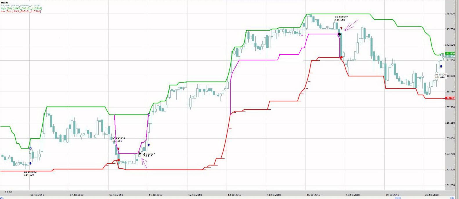 Помогите пожалуйста. У меня есть идея усовершенствовать индикатор уровней «Максимум за/Минимум за», чтобы в моменты резкого изменения цен уровни Hi/Lo ускорялись вслед за ценой. Необходимо, чтобы уровни Hi/Lo находились от цены закрытия последней свечи не дальше определенной величины. Этого можно добиться введением в индикатор переменной N. То есть, когда разность между ценой Hi/Lo и ценой закрытия последней свечи становится больше N, уровни Hi/Lo должны переместиться на расстояние N от цены закрытия последней свечи, тем самым подтягивая уровни Hi/Lo ближе к цене. Получается своеобразный трейлинг стоп, интегрированный в канал Дончиана. По моему мнению, с помощью этой модификации канал Дончиана должен более четко отслеживать тренды при большой волатильности рынка, делая входы и выходы по более выгодным ценам. О результатах тестирования этой идеи обязательно отпишусь. Идею продемонстрирую на следующем примере: На Рис.1. показаны стандартные каналы «Максимум за/Минимум за» на получасовках. Примерно 8.10.2010 цена резко пошла вниз, а индикатор очень сильно отстал, поэтому покупка произошла по цене 136,91р, а могла произойти по цене 133,75р при наличии параметра ускорения, аналогичная ситуация и с продажей (см. нижний канал).