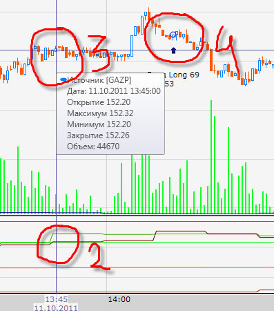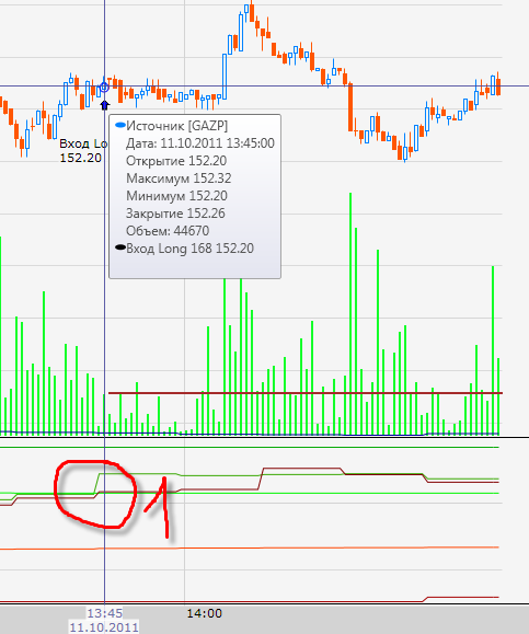 Сегодняшний случай малопоказателен, там плохо видно пересечение, прошлый более илюстративный. Рис. 1 Рис. 2 Первый рисунок лаборатория, второй боевой скрипт (скрипт один и тот-же просто первый открыт "Управление скриптами", второй "Управление торговлей скриптами" и "Старт" у него нажат). На первом риснке видно, что в 13.44 произошел пересчет сжатия, и темно зеленый индикатор пересек снизу вверх (отмечено цифрой 1), светло зеленый (предыдущие 15 минут были близко, но фактически пересечения не было)и на скрине видно, что в 13.45 есть сигнал на вход. На боевом-же то-же самое место отмечено цифрой 2 для индикатора , цифрой 3 на графике, сигнала нет. Точка входа отмечена цифрой 4, это я руками воткнул кнопку "Выполнить по рынку" в менеджере команд. В реальном времени все выглядит немного по другому, даже в лаборатории, сигнала в 13.45 не было, он появился в 14.00, добавилась запись в менеджер команд, соответственно без флага "Выполнено".