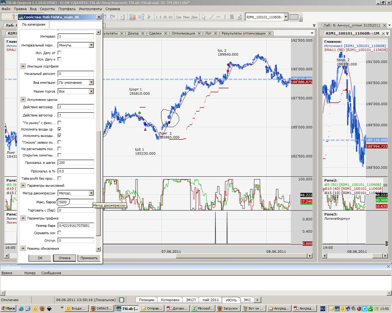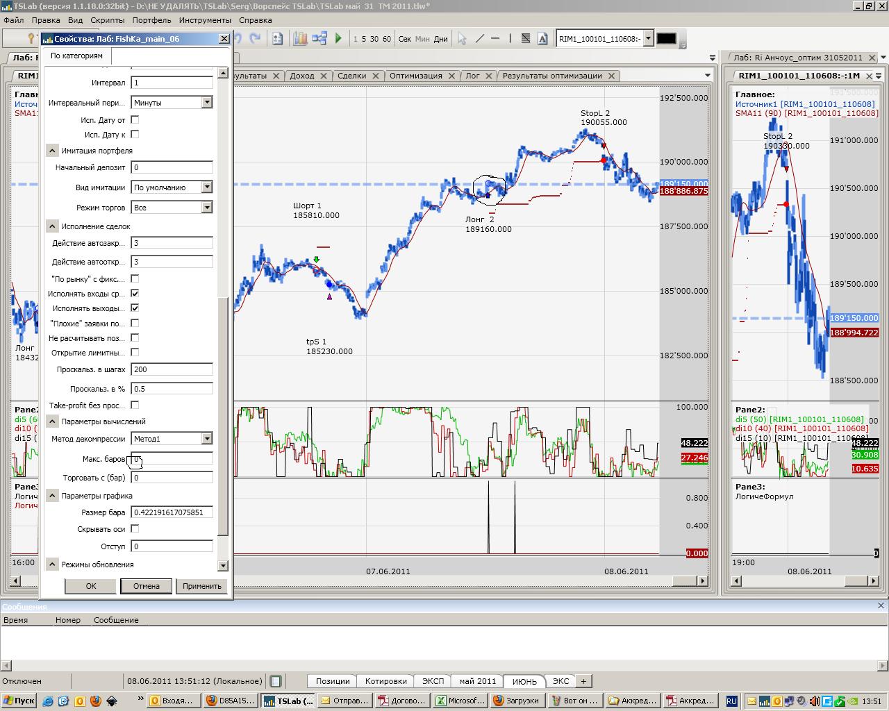 Доброго дня всем ! Сегодня примерно в 17 час 40 мин, взглянув на монитор ( фортс, rim)увидел,что боевой скрипт (Fishka квадро main) почему-то зашел в позицию лонг намного позднее, чем его брат близнец в лабе...Первая мысль - при оптимизации и копировании в выходные скопировал не тот файл ...Мысли мечутся,судорожно перебирая возможные варианты развития событий, конечно приходит самый пессимистичный - кривой скрипт, "все пропало, гипс снимают, клиент уезжает"....ДЕПО в- в ноль.Учитывая, что копия показывает правильный результат (есть вход в 11 час после закрытия шорта и логика соблюдена), принято решение остановить скрипт, удалить его из портфеля,закрыв позы, что и было сделано ( кстати, через менеджер команд -заявки без проблем были закрыты позы- вполне комфортное решение , но обещали еще лучшее решение, ждем.....)Удалив проблему более спокойно проаналировал ситуацию - понял, что боевой скрипт отработал правильно, просто был пропущен ПЕРВЫЙ сигнал на вход ( примерно в 11 05), и был реализован второй сигнал ( в 16 58)из-за провайдера, на что м-р Nektodron и указывал ранее ( паркинг!!!)Поняв причину, принял решение взять паузу и понаблюдать со стороны.Обратив взор на монитор примерно в 21 час, понял, что и на копии исчез ПЕРВЫЙ сигнал, а вход появился на втором сигнале.Т е отсутствуют ПЕРВЫЕ сигналы как на боевом скрипте, так и на копии. Не сообразил пофиксить и перезагрузив лабу получил еще одну картину маслом...которую успел пофиксить (см .скрин)на КОПИИ боевого скрипта отсутствует первый вход, а на БОЕВОМ скрипте ПОЯВИЛСЯ первый вход, из-за отсутствия которого и был удален скрипт из портфеля и пр.пр. !!!! Понимая, что прога классная и с ее помошью я прибавил к депо с 23.05.2011 +10% и учитывая изложенное прошу прокоментировать ситуацию,которая ввызывает недоумение,по крайней мере.... логи на contact...