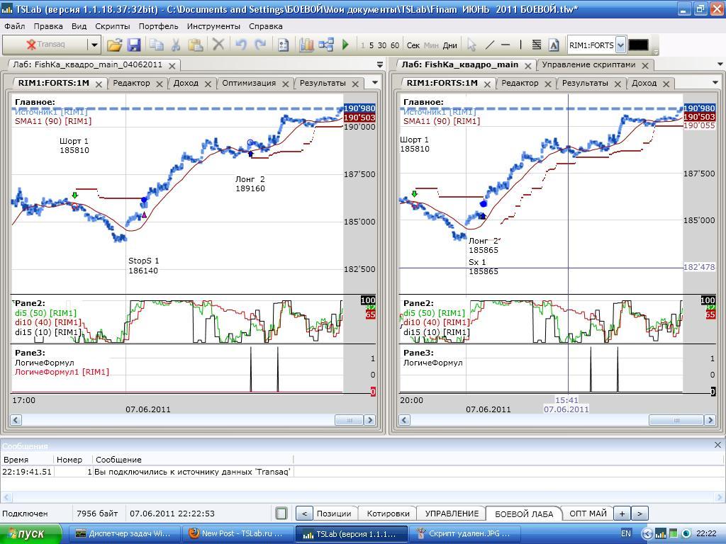 Доброго дня всем ! Сегодня примерно в 17 час 40 мин, взглянув на монитор ( фортс, rim)увидел,что боевой скрипт (Fishka квадро main) почему-то зашел в позицию лонг намного позднее, чем его брат близнец в лабе...Первая мысль - при оптимизации и копировании в выходные скопировал не тот файл ...Мысли мечутся,судорожно перебирая возможные варианты развития событий, конечно приходит самый пессимистичный - кривой скрипт, "все пропало, гипс снимают, клиент уезжает"....ДЕПО в- в ноль.Учитывая, что копия показывает правильный результат (есть вход в 11 час после закрытия шорта и логика соблюдена), принято решение остановить скрипт, удалить его из портфеля,закрыв позы, что и было сделано ( кстати, через менеджер команд -заявки без проблем были закрыты позы- вполне комфортное решение , но обещали еще лучшее решение, ждем.....)Удалив проблему более спокойно проаналировал ситуацию - понял, что боевой скрипт отработал правильно, просто был пропущен ПЕРВЫЙ сигнал на вход ( примерно в 11 05), и был реализован второй сигнал ( в 16 58)из-за провайдера, на что м-р Nektodron и указывал ранее ( паркинг!!!)Поняв причину, принял решение взять паузу и понаблюдать со стороны.Обратив взор на монитор примерно в 21 час, понял, что и на копии исчез ПЕРВЫЙ сигнал, а вход появился на втором сигнале.Т е отсутствуют ПЕРВЫЕ сигналы как на боевом скрипте, так и на копии. Не сообразил пофиксить и перезагрузив лабу получил еще одну картину маслом...которую успел пофиксить (см .скрин)на КОПИИ боевого скрипта отсутствует первый вход, а на БОЕВОМ скрипте ПОЯВИЛСЯ первый вход, из-за отсутствия которого и был удален скрипт из портфеля и пр.пр. !!!! Понимая, что прога классная и с ее помошью я прибавил к депо с 23.05.2011 +10% и учитывая изложенное прошу прокоментировать ситуацию,которая ввызывает недоумение,по крайней мере.... логи на contact...