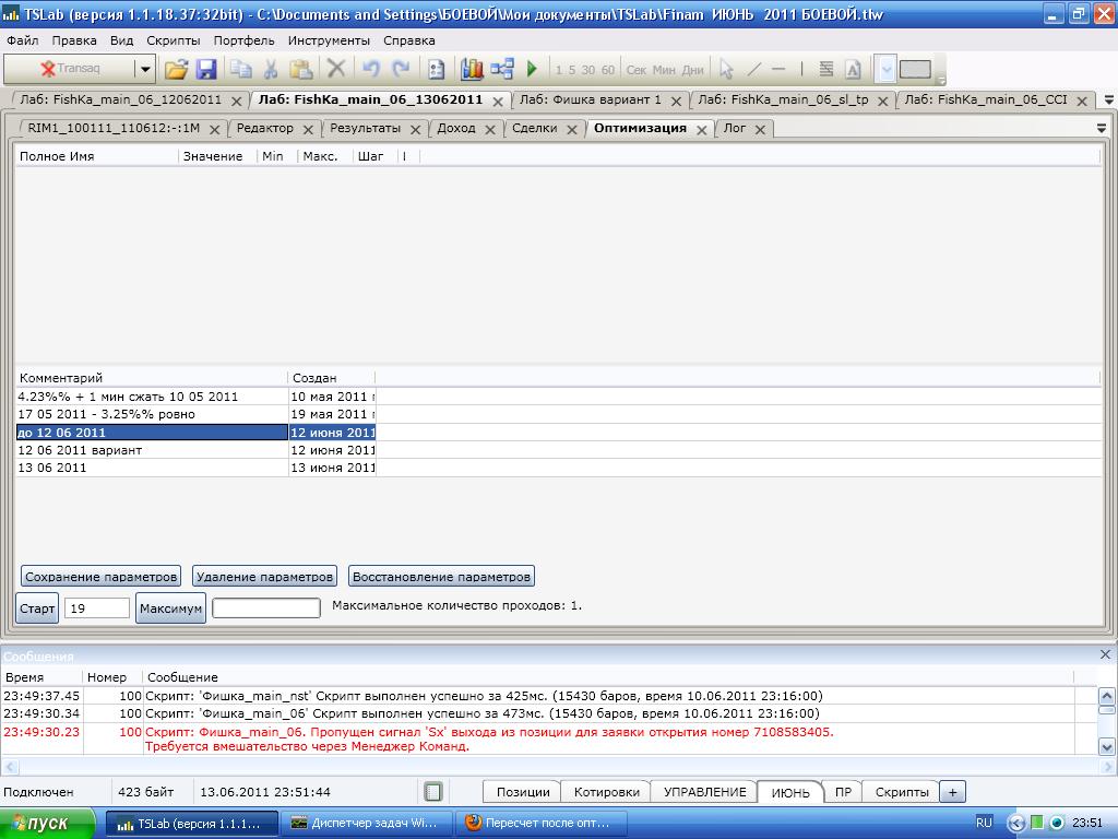 В конце вечерки скрипт зашел в шорт.После оптимизации скрипт насчитал выход из шорта вход в лонг и повторный вход в шорт ( в конце вечерней сессии).прога ругается, пишет пропущен выход и пр.....