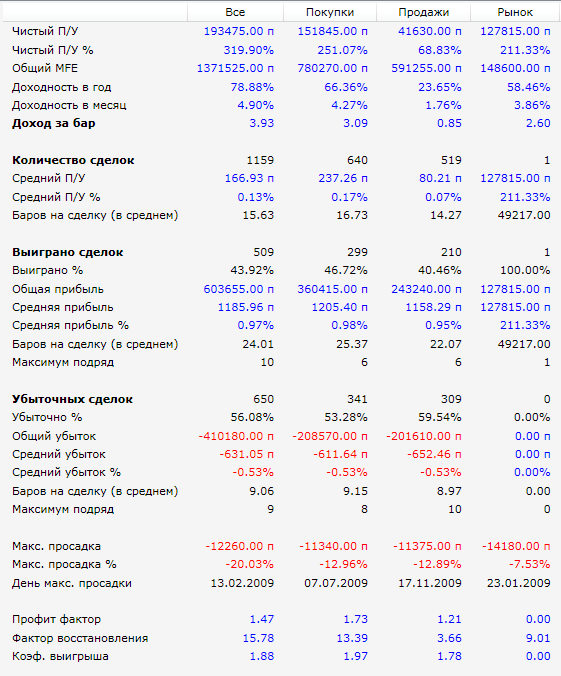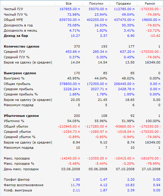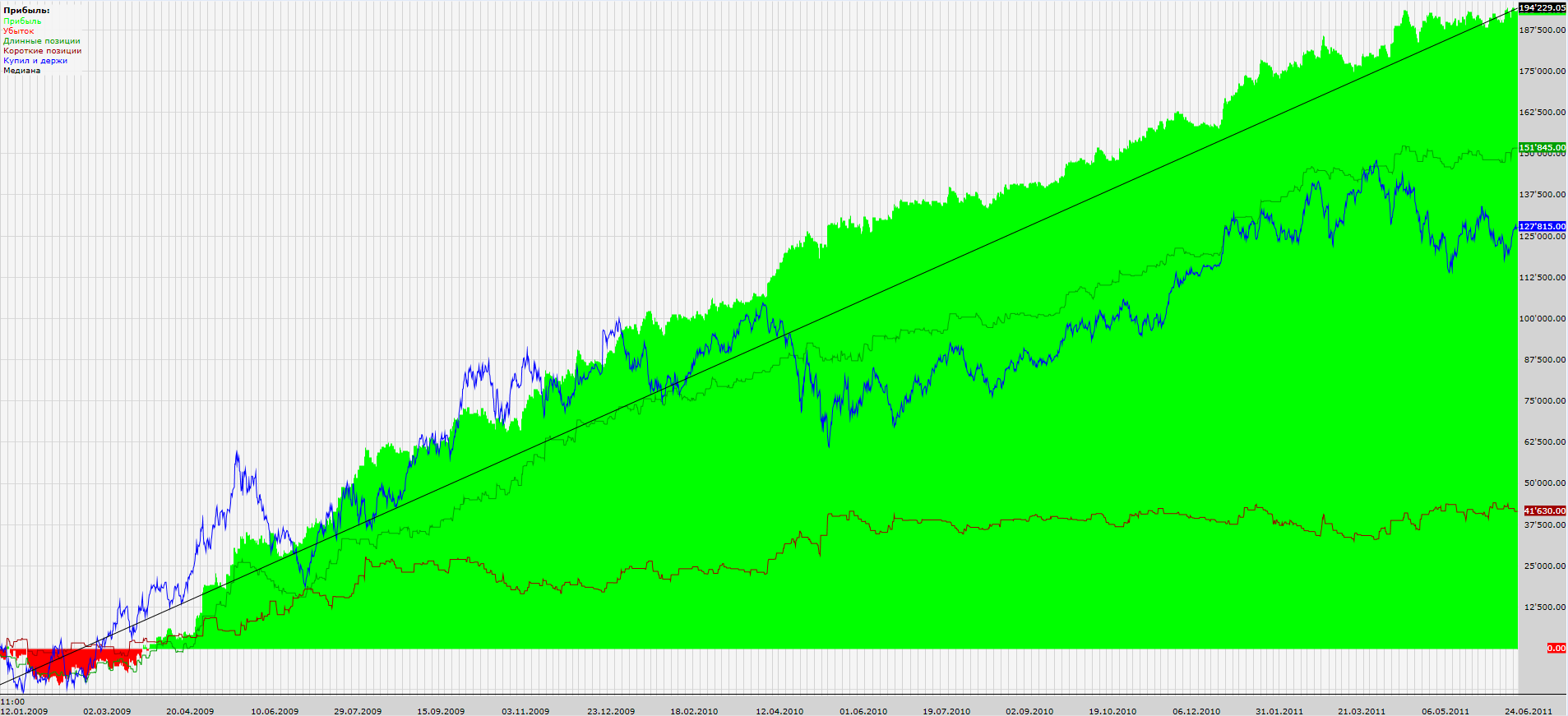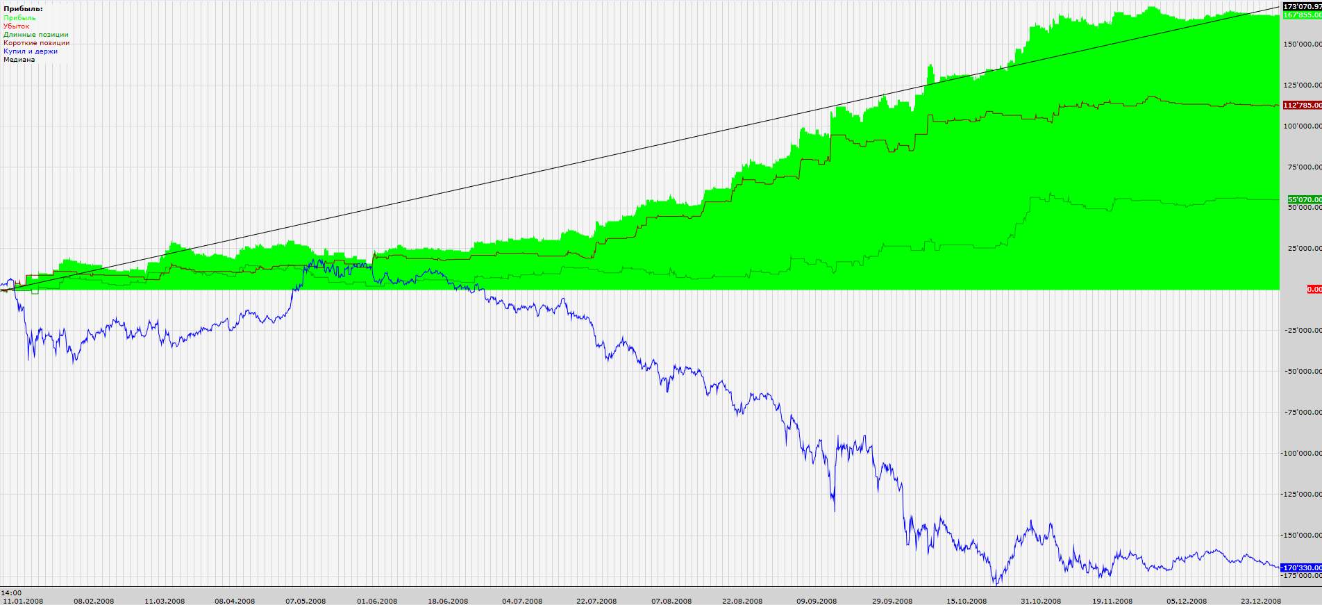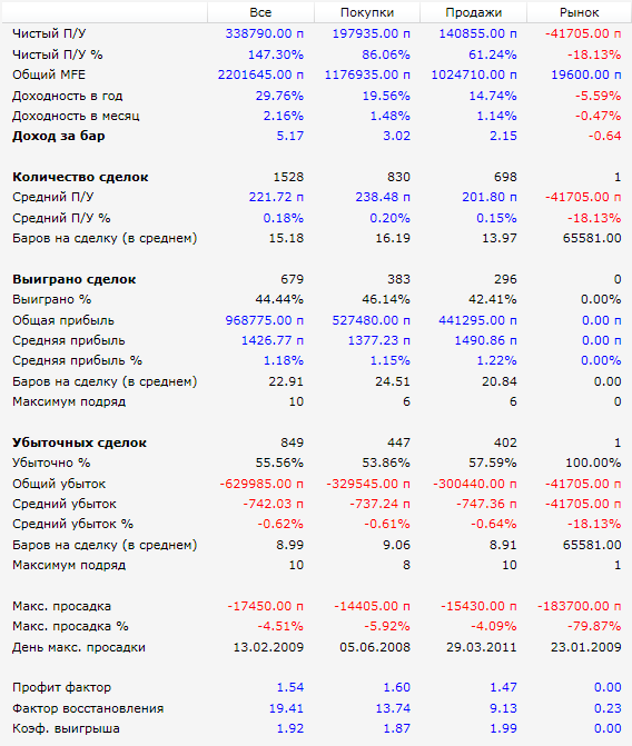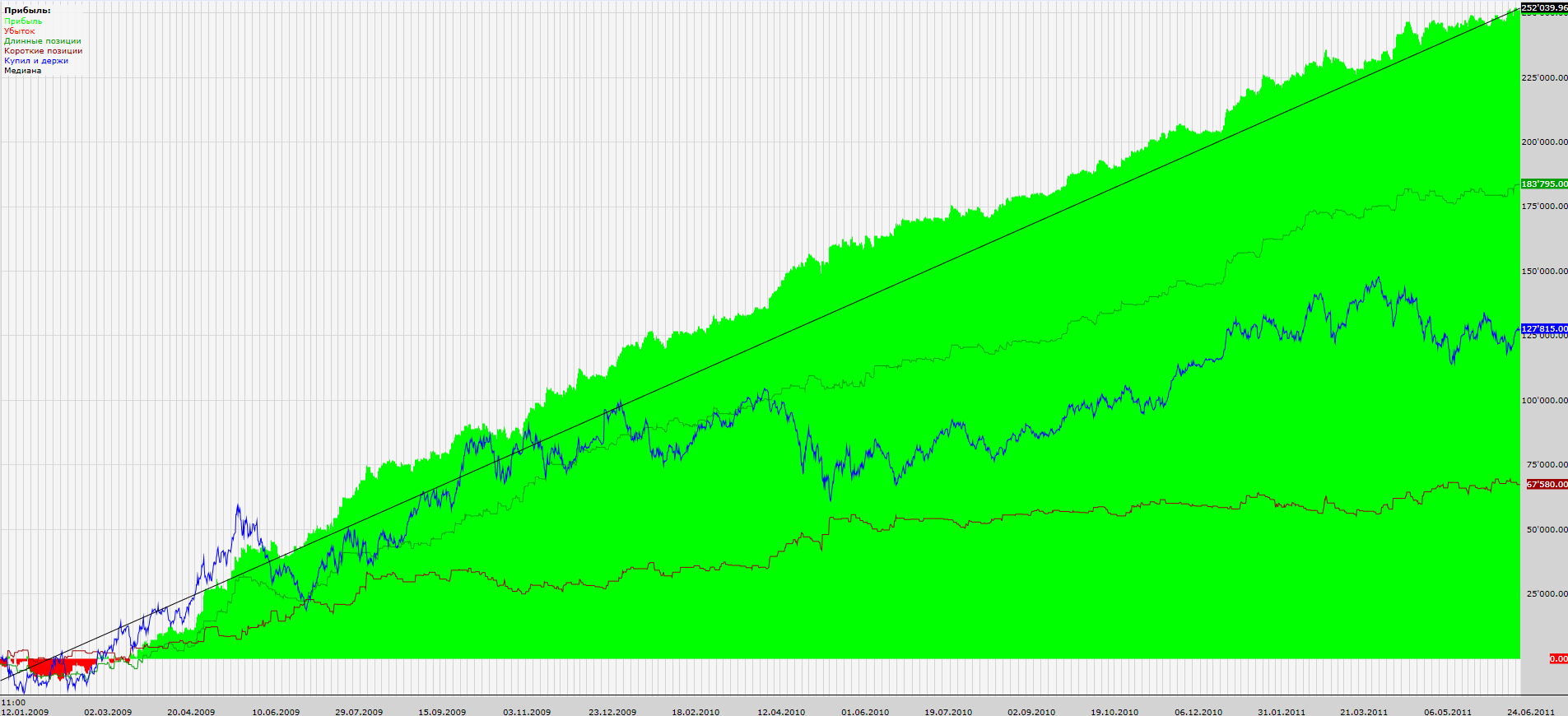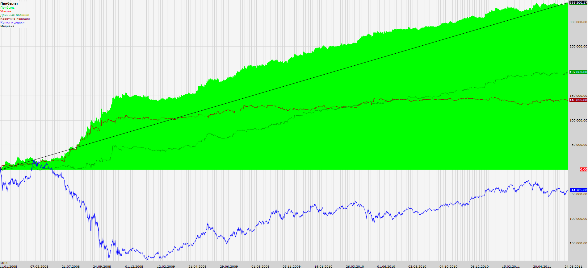 Вот результаты с начала 2009 года по конец июня 2011 (фьючерс на индекс РТС, проскальзывание 30 п. на круг):
