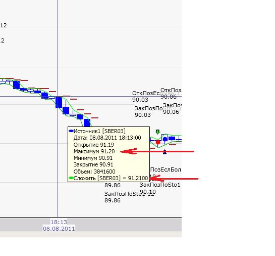 Посмотрите внимательно график и скрипт, у заявки, которая на этой свече цена 91,2 (на 1 коп выше максимума предыдущей всечи)и максмум этой свечи как раз и равен 91,2. Видите коричневую черту, которую как раз и достиг максимум свечи? А т.к. эта заявка не исполнилась, то на следующей свече выставилась новая заявка и теперь уже 91,21, т.е. на 1 коп выше максимума свечи, котрую мы с Вами рассматриваем.