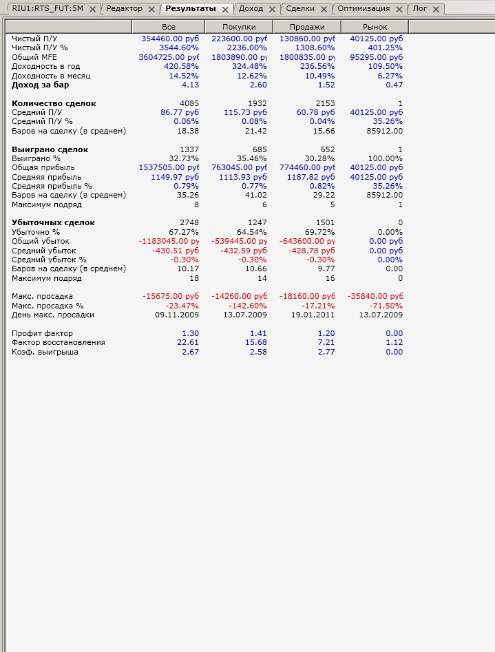 Подскажите пожалуйста, какие параметры результатов лучше бы улучшить (профит фактор, коэфф. выигрыша и т.п.). Тестил стратежку по истории с 2009 года. Проскальзывание 50 п.