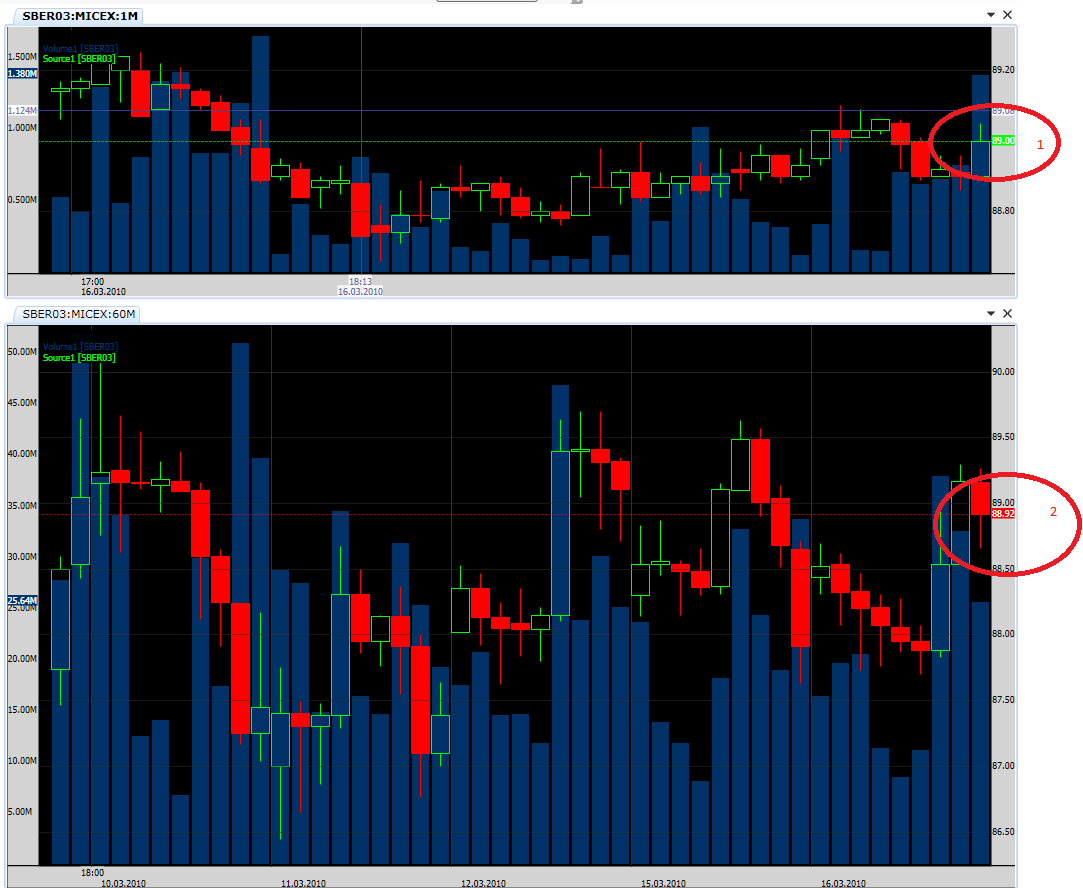 Раньше мы оставляли так, как есть, но этот мусор сбивает индикаторы, и было принято решение, эти свечи (а так же сделки с ММВБ пришедшие после 18.45) отрезать. К сожалению отрезать можно, только на интервалах 1,5 и 15мин, на 30мин и 60мин отрезать сделки после основной сессии нельзя.
