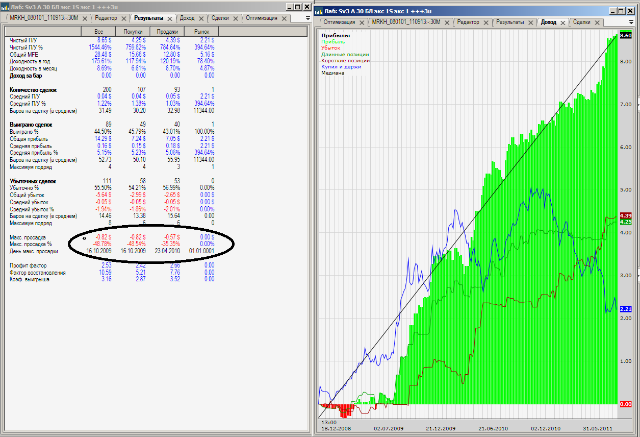 Холдинг МРСК, Т-Ф 30М. На кривой эквити видно, что в указанных в "Результатах" датах просадок в 48 и 35 % нет, а в таблице есть.