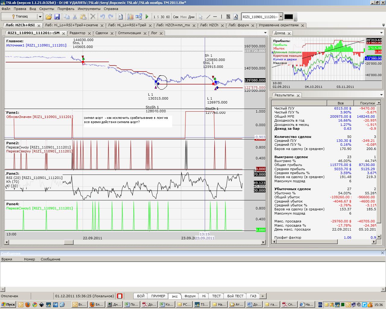Коллеги ! Про входы выходы внутри свечи : входы внутри - блоки открытие выше (ниже,), выходы - стоп лоссы ( числовые данные, а не условия).Блоки, которые выдают услови, как правило, все работают на следующую свечу.Это мое мнение......, поправьте, если не так, сам мучился со входами выходами внутри свечи..... Ссылку не нашел, есть пример: во вложении - пример триггера с ОЗ, наваял Vil. ничего кроме пересечений не надумал, может кто чего подскажет?. ЗЫ даже в таком примитиве довольно неплохо.... Оптимизация фьючерс РТС,с 01 01 2005 по 01 09 2011.Фрейм 5 мн. вот еще сылка про входы выходы : http://www.tslab.ru/ubb/ubbthreads.php?ubb=showflat&Number=32834&Searchpage=2&Main=3177&Words=%D1%81%D0%B2%D1%8F%D0%B7%D0%B0%D0%BD%D0%BD%D1%8B%D0%B5+%D0%B7%D0%B0%D1%8F%D0%B2%D0%BA%D0%B8&Search=true#Post32834