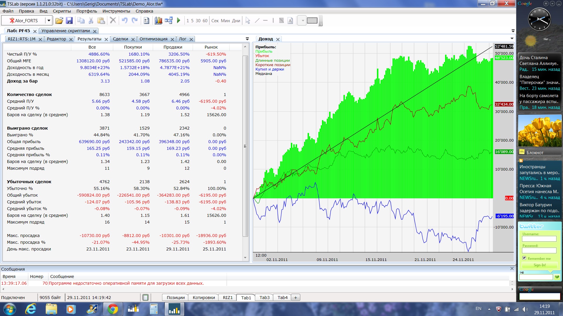 Добрый день уважаемые коллеги! Как раз сегодня хотел написать в форум о моем "опыте". Удалось в конце концов составить доходный алгоритм, который совершает в день примерно 100-150 сделок. На исторических данный показывает просто фантастическую доходность примерно 7000 рублей на один контракт фьючера РТС. Запустил я его, но больше 8 сделок алгоритм сделать не может, выскакивает сообщение в менеджере команд о пропущенном сигнале. Приходится каждый раз вручную закрывать по рынку. Так что получается полуавтоматическая торговля. Не могу понять в чем дело. Пытался менять таймфреймы с 30 секундного до 1 минуты и 5 минут, но результат тот же - пропуск сигнала. Подскажите.