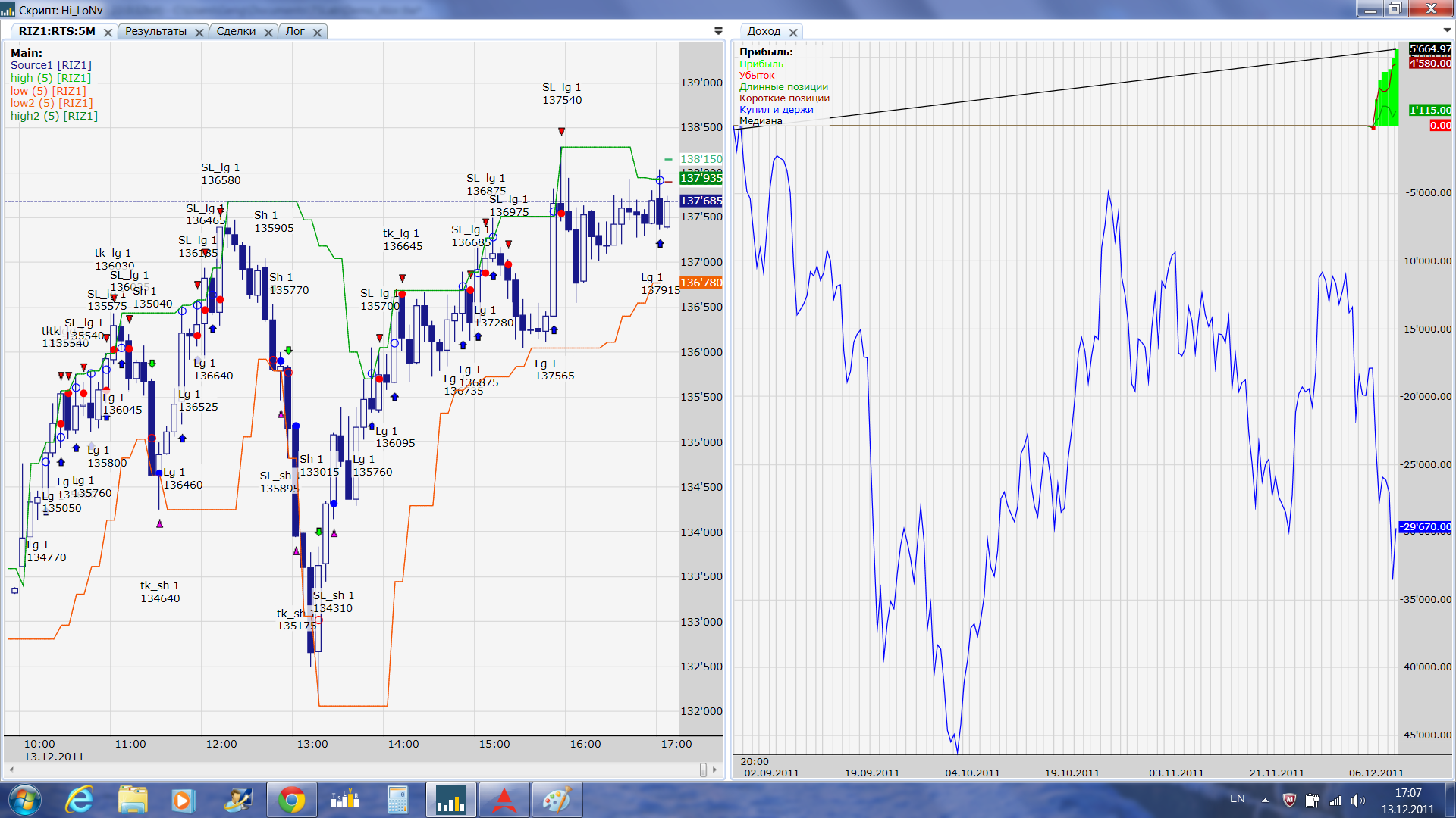 Работает. На один фьючерсный контракт индекса РТС приносит 1500-4300 рублей в день. Правда были две посадки по 200 и 500 рублей. Вчера был форс-мажор: на утренней сессии была открыта позиция в лонг (меня рядом с компьютером не было, я не постоянно могу находится рядом) произошли проблемы с интернетом. Когда вернулся домой выяснилось, что рынок пошел вниз и позиция принесла 7000 убытка. Скрипит рабочий я его постоянно модифицирую по результатам реальных торгов. Сегодня эти 7000 тысяч отыграл - запустил одновременно два скрипта.