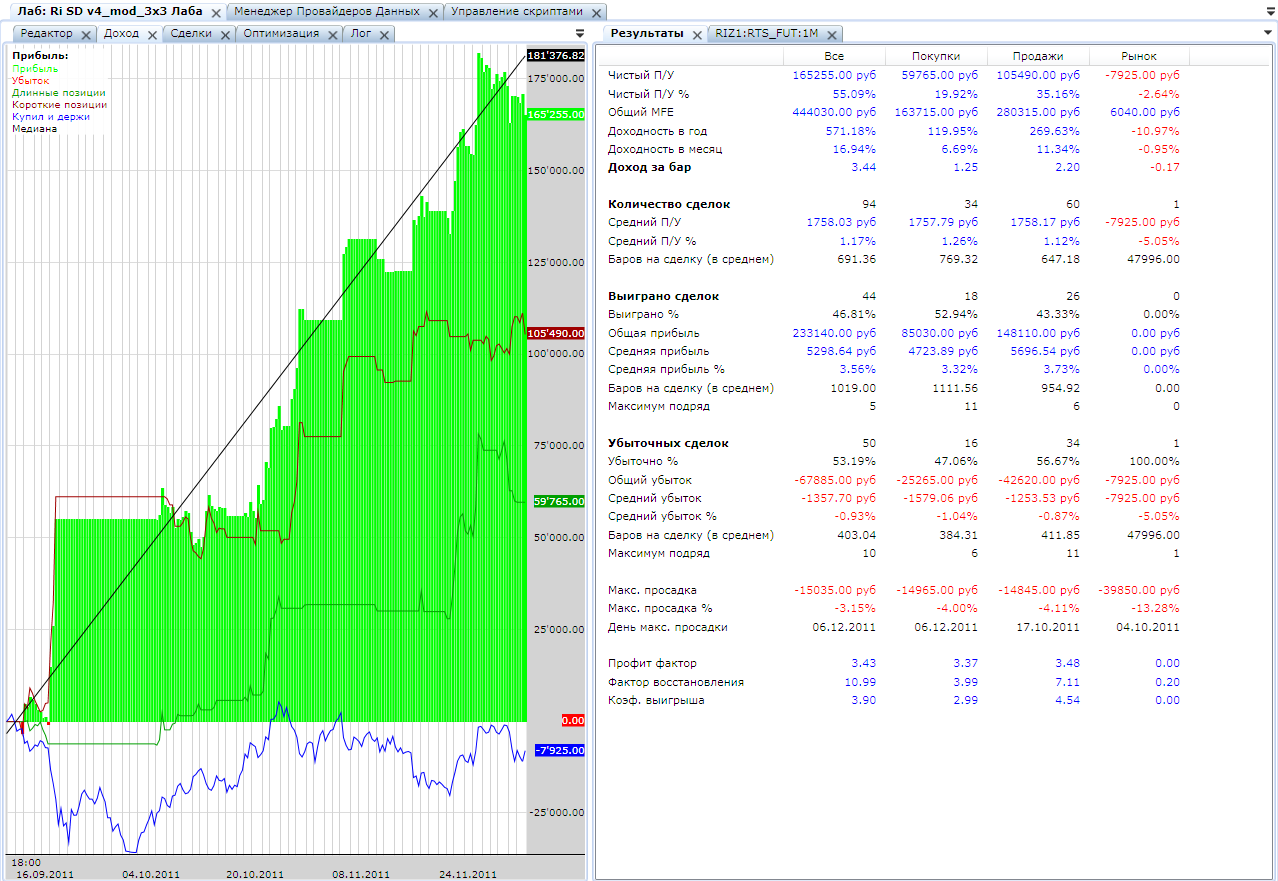 1. Скрипт на три входа "Ri SD v.4 3x3", без управления количеством позиций. Ставить можно и в лотах и в % от портфеля. НО!!! важно помнить, что скрипт на три входа в позицию и поставив в лимитах 1 лот, торговать он будет тремя!!!!