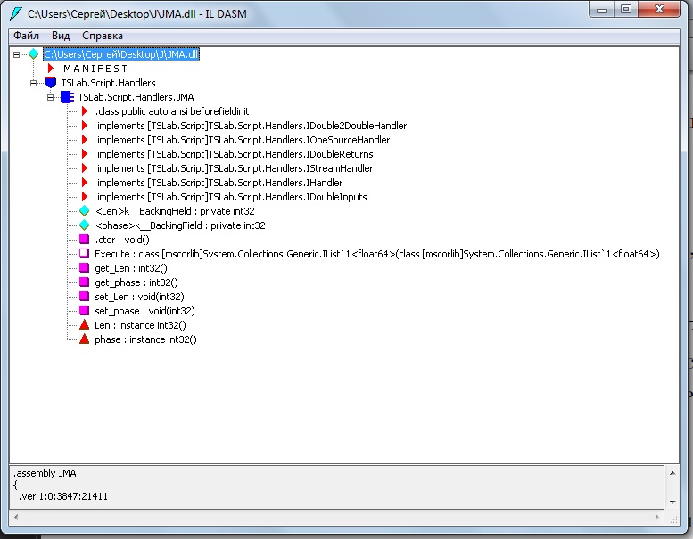 Воспользовавшись IL DASM вижу, что структура файла JMA.dll, совпадает с исходником этого файла. Вот начало его исходника: using System; using System.Collections.Generic; using TSLab.Script; using TSLab.Script.Handlers; using TSLab.Script.Helpers;