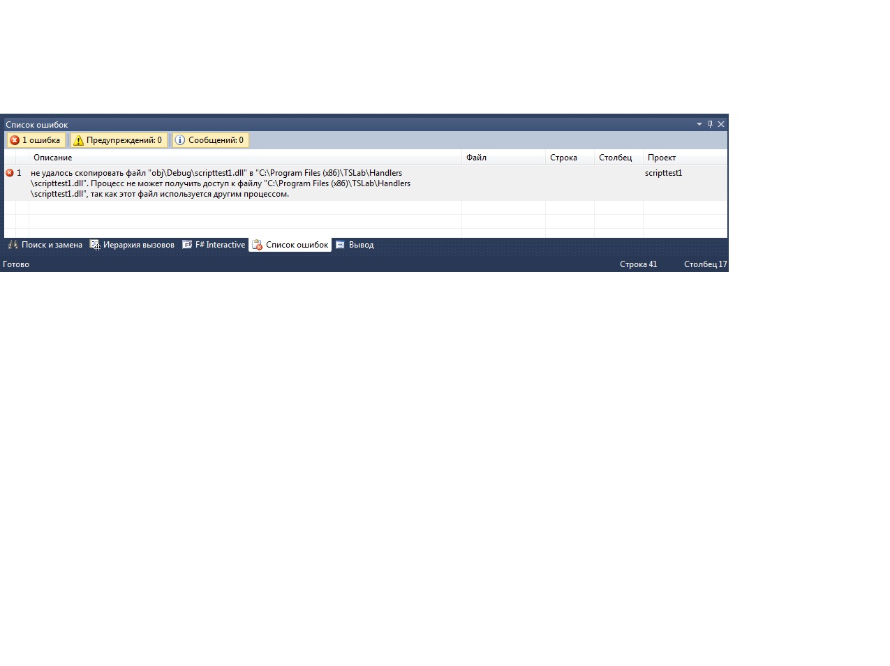Ошибка 1 не удалось скопировать файл "obj\Debug\scripttest1.dll" в "C:\Program Files (x86)\TSLab\Handlers\scripttest1.dll". Процесс не может получить доступ к файлу "C:\Program Files (x86)\TSLab\Handlers\scripttest1.dll", так как этот файл используется другим процессом. scripttest1