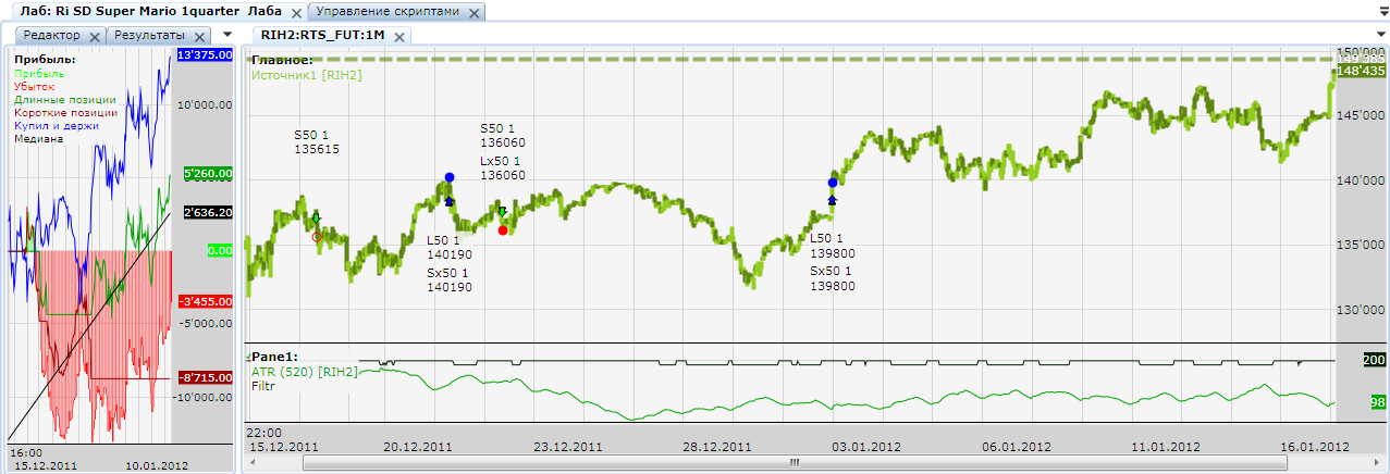 К вопросу о дисциплине в торговле. Запустив свой же скрипт в торговлю, я допустил несколько ошибок: 1. Запустил до окончания старого контракта на новом контракте. Аккурат под психоз на экспирацию. 2. Отключал на длительные выходные из боязни гэпа. 3. Мешал скрипту ручками при сильной просадке. Результат этого вмешательства видно на трансляции. А должно было быть с 15.12.2011 всего 4 сделки и небольшой (-3500 пп) минус. Конечно просадка не повод для радости, но на таком рынке как сейчас трендовикам очень тяжело. Кто торгует - подтвердит. Даже не знаю кому такой рынок по кайфу, скальперам или пипсовщикам? Но думаю всем не очень. Так вот на будущее, никакого вмешательства руками, благо алгоритм продуман до мелочей. Чесслово, сам себе по рукам бить буду. [u][/u]