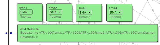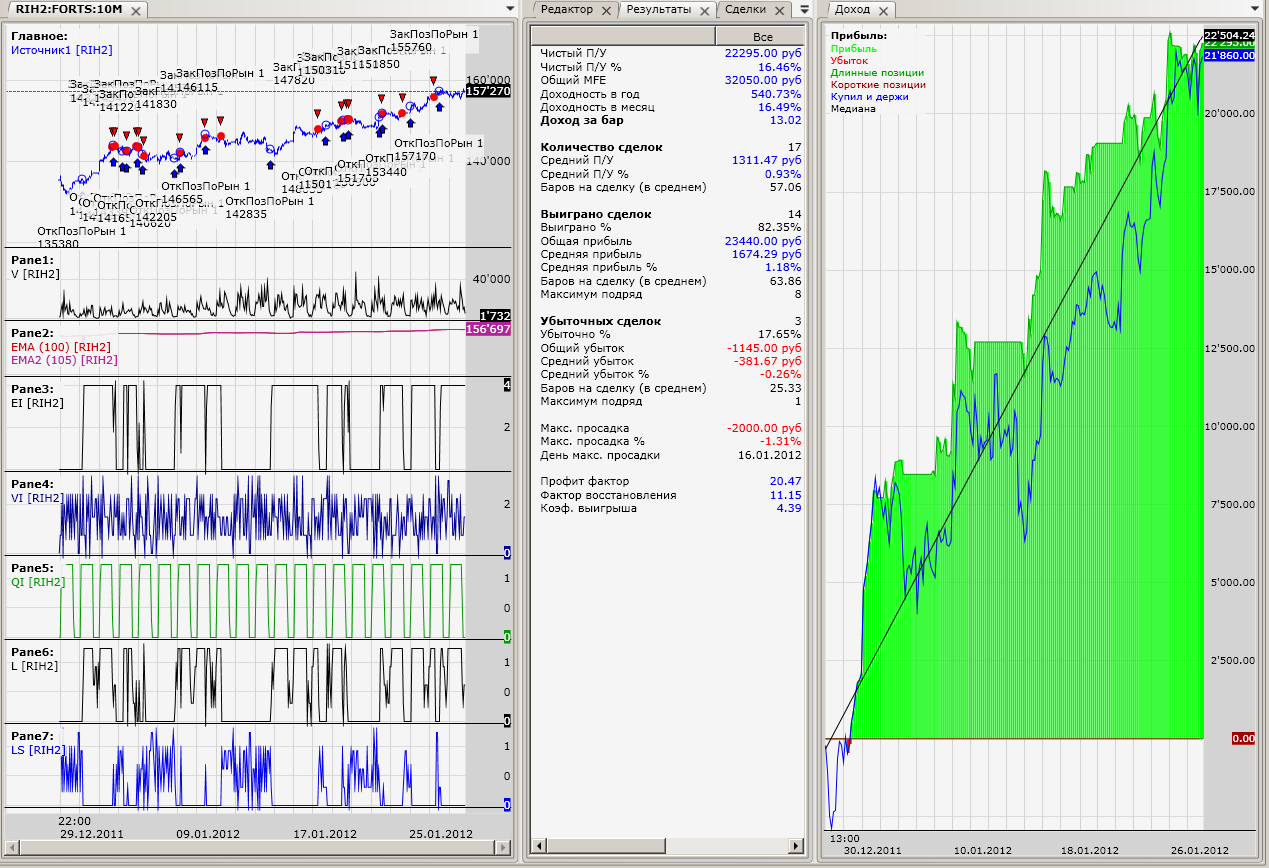 Для построения скрипта в визуальном редакторе можно использовать схему "накопление аргументов" за или против сделки. Для открытия или закрытия позиции мы смотрим на совпадение ряда заданных условий. Каждое условие анализируем отдельной формулой, и в зависимости от того, выполнено оно или нет, присваиваем ему очки в зависимости от "ранга" условия. Далее анализируем логической формулой собранную информацию и если аргументов "за" больше заданного значения, совершаем сделку. Пример для "двух скользящих": 1. Быстрая выше медленной, присваиваем 4, для этого в формуле пишем EMA1>EMA2?4:0 2. Объёмы растут, присваиваем 3, для этого пишем в формуле vol[i]>vol[i-1]?3:0 начинать с 1 (видимо объёмы лучше смотреть сглаженные МАшкой, но это уже частности). 3. Время торгов - основная сессия, но после утреннего гэпа, присваиваем 1, для этого в формуле пишем: time>100500&time<184500?1:0 Дальше собираем условия в логической формуле (формула1+формула2+формула3)>=7 это и будет сигнал на открытие длинной позиции. Таких условий может быть бесконечное множество и каждому условию можно продумать "ранг", впрочем для открытия сделки не обязательно набирать полное количество "очков", достаточно что бы перевес был в пользу "за". Для закрытия можно продумать отдельные условия, а можно набором из тех же. В отличии от простой записи условий в строчку в одной лог формуле, этот метод позволяет разделить условия по значимости и торговать при совпадении только ряда условий. Более того, ранг каждого условия можно "тестировать" и "оптимизировать", если вместо числа в формуле ставить ссылку на константу. Так же этот "ранг" может меняться в зависимости от дополнительных условий. В общем обширное поле для творчества)))) На мой взгляд просто, логично и удобно.