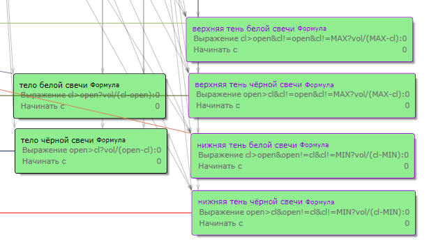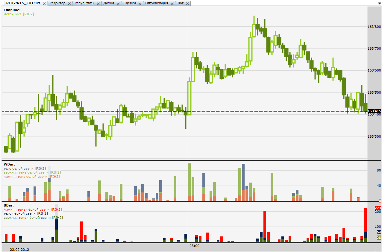 1. Это минутки на картинке. 2. Модель скрипта на этом не строил и даже не пытался (как то не сложилось вдохновение). 3. Использую иногда как вспомогательный фильтр, но в несколько изменённом варианте. Его не сложно прописать в формуле самостоятельно. Просто понимаем, что для белой свечи: тело - сила быков, основное движение, ставим в плюс, нижняя тень - деньги отжатые у медведей в трудной борьбе, тоже ставим плюс, верхняя тень - отступление быков, ставим минус. Дальше считаем сколько объёма пришлось на каждую часть и делаем выводы))) Аналогично, но всё наоборот для чёрной свечи. 4. Не стоит, на мой взгляд, увлекаться объёмами как таковыми. Потому что на каждый хитрый объём всегда найдётся кукл с винтом. 5. Не имеет смысл брать в расчёт HFT-ников, пусть себе сливают на высоких скоростях. HFT профит это самое большое нае...лово на бирже)))) в смысле сказки брокеров и биржи, рассказанные трейдерам на ночь.