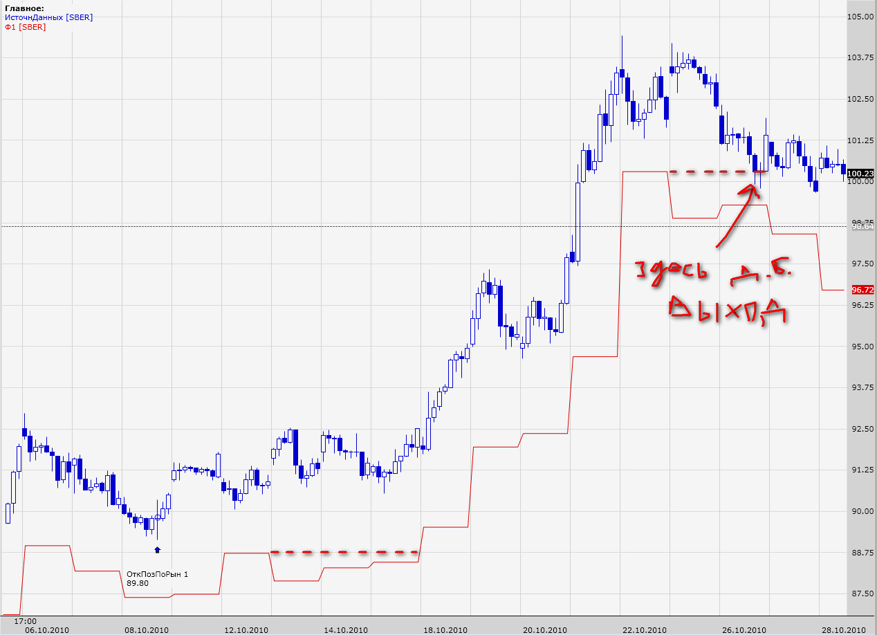 Что не так: Эта линия (Ф1) должна быть как трейлинг стоп, т.е. При расчете в начале дня если она (Ф1) ниже по расчетам предыдущего дня, то должно остаться значение прошлого дня. И это должно расчитываться только при открытой позиции...