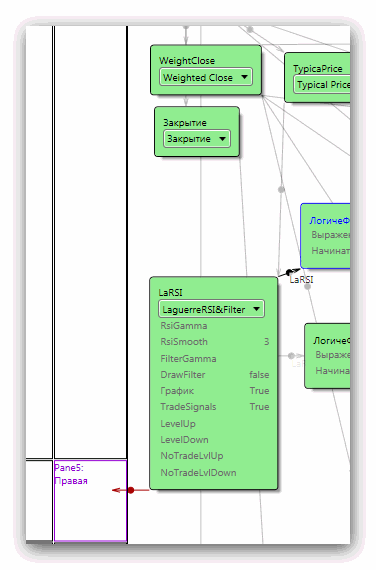 на графике: - синий - LaguerreRSI - красный LaguerreFilter - зелёный пунктир - уровни перекупленности\перепроданности - голубой пунктир - границы неторговой зоны (где сигналы купли\продажи не работают) параметры кубика (см. скриншот №2): 1. RsiGamma - от 0.05 до 0.99 - то же, что Период в других индикаторах 2. RsiSmooth - сглаживание графика, позволяет сгладить пилу и уменьшить количество ложных сигналов 3. FilterGamma - то же, что п.1, но для линии фильтра (красный) 4. График - если выбрано, то график строится сам, как на первом скриншоте, отрисовывая все линии и уровни. При этом от кубика в редакторе можно либо вообще ничего не выводить на график, либо вывести один нужный параметр, например торговые сигналы (на первом скриншоте нижняя панель) 5. DrawFilter - если выбрано, кубик возвращает линию фильтра (красная на первом скриншоте), а не RSI или торговые сигналы 6. TradeSignals - если выбрано, кубик возвращает сигналы (+1 или -1) о пересечениях графика RSI с графиком фильтра. У этого чекбокса приоритет над DrawFilter, так что если выбраны оба, то будет выводиться TradeSignals 7. LevelUp, LevelDown - уровни перекупленности\перепроданности (на сигналы не влияют, просто выводятся на график) 8. NoTradeLvlUp, NoTradeLvlDown - верхняя и нижняя границы зоны, пересечения в которой не считаются сигналами и игнорируются, что позволяет отсечь много ложных сигналов