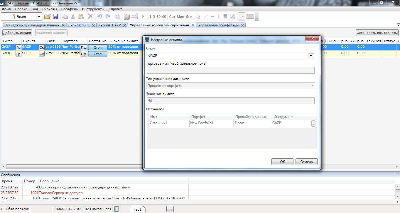 Запущено 2 скрипта на 2-х разных инструментах, демо-доступ, значения лимита 50% от портфеля в обоих случаях, но сделки совершаются по 1 лоту. Что делаю не так? Спасибо