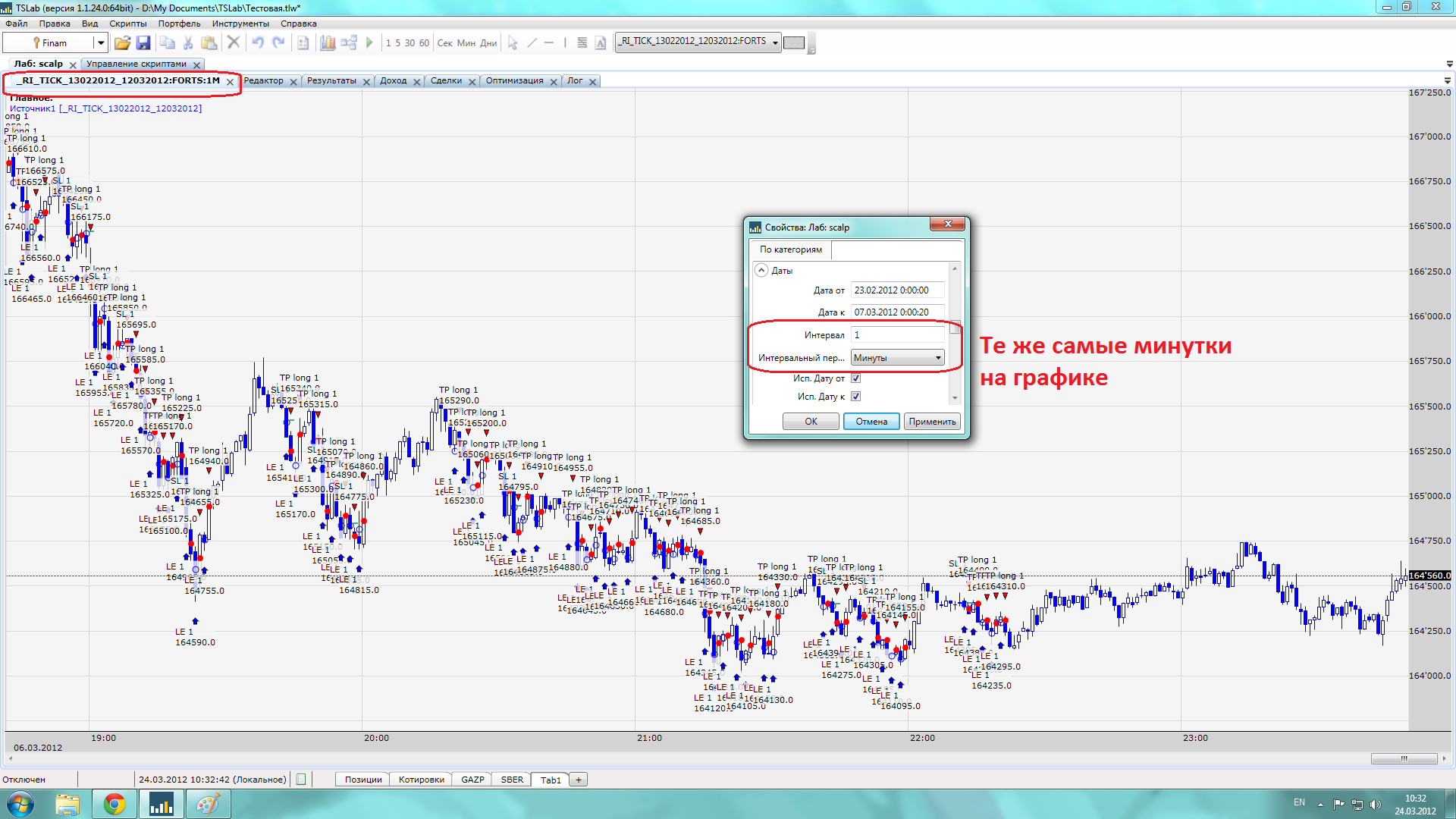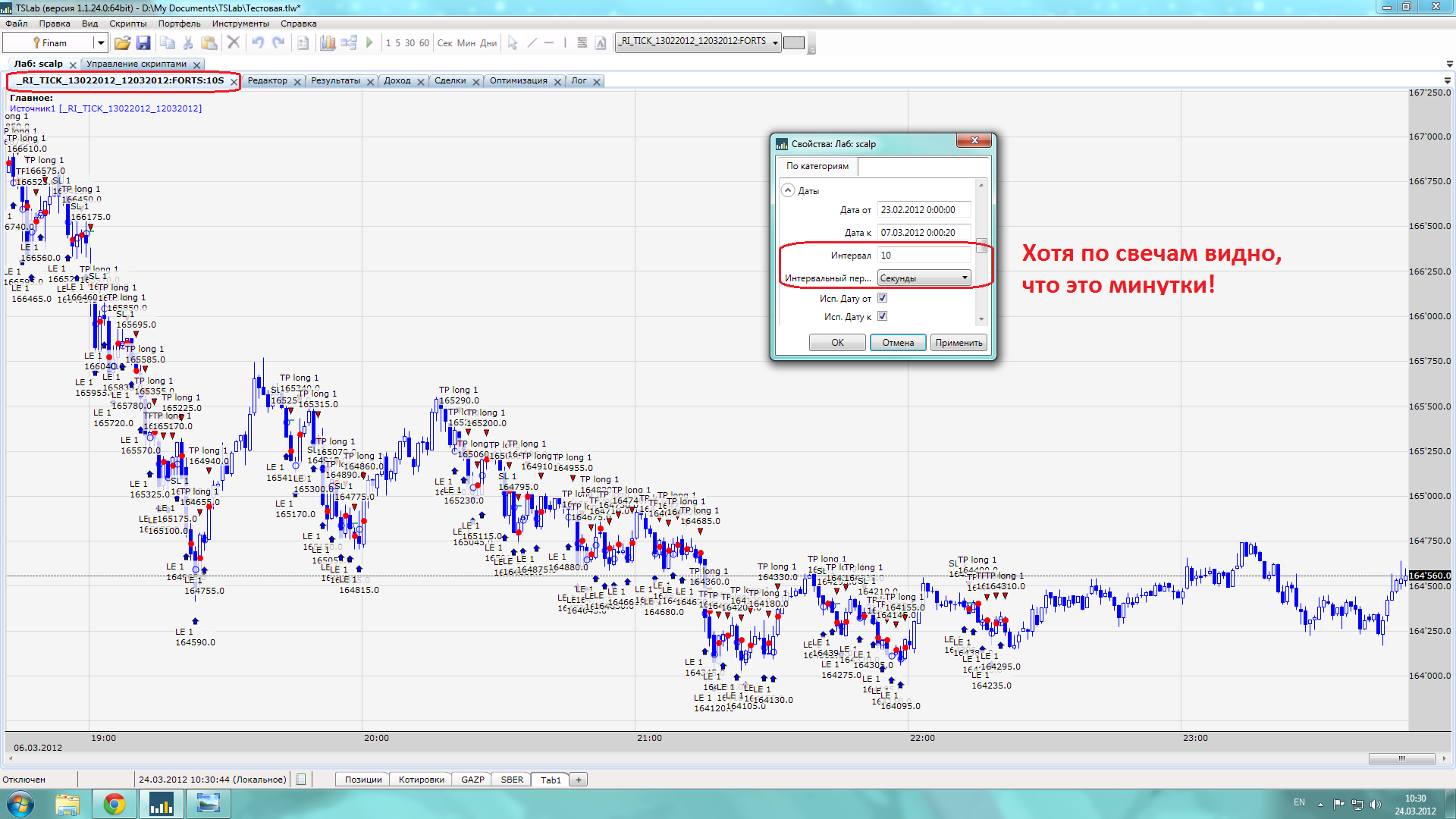Есть простой алгоритм. Первоначально тестил на тиковом источнике, задал в свойствах скрипта интервал 10 секунд. (см. скрин 1). Получалось так, что фактически на графике минутные свечи и торговля идет по ним. Изменял интервал на 1 минуту и ничего вообще не менялось: ни сделки, ни результат, ни кол-во баров в логе.(см. скрин 2). Отсюда делаю вывод, что хоть и стоит файл-источник тиковый, и какой интервал ему не задавай до 1 минуты - торги идут на 1М.