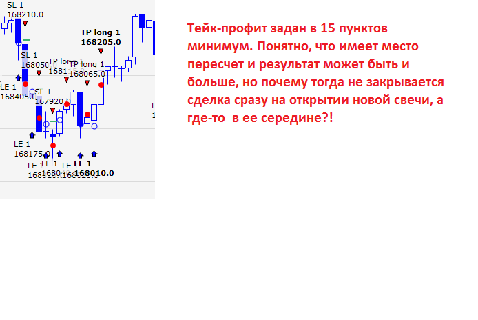 Вопросы: 1. В чем может быть причина таких расхождений? 2. Как получить график в свечах в 5с или 10с? 3. Как вообще работать с тиками, если с ними невозможно даже за неделю провести оптимизацию, т.к. все тупо виснет? 4. Если используется тиковый источник, можно ли из него сделать любой фрейм без сжатия, а именно графиком? 5. Также непонятно как происходят сделки: имеем тейк-профит 15 пунктов, фактически часто это условие наступает на той же свече, где было открытие позиции, т.о. должно произойти закрытие сразу на новой свече, но закрывается сделка позже. (см. скрин 3) В чем причина?